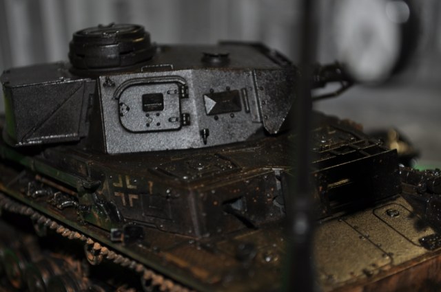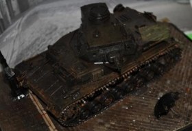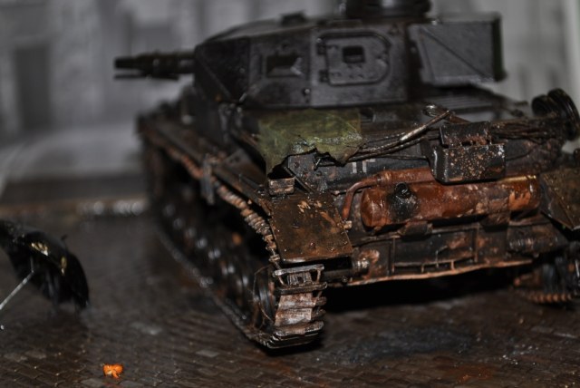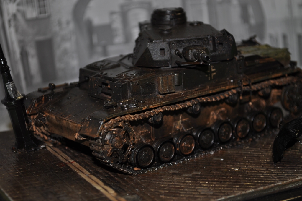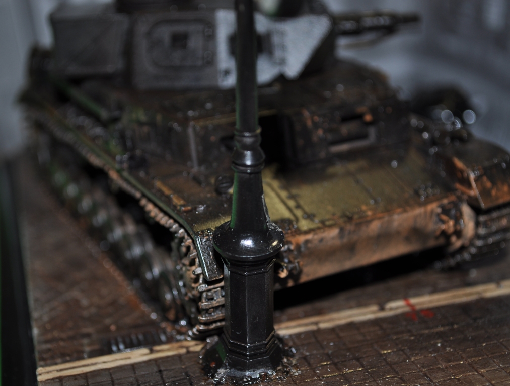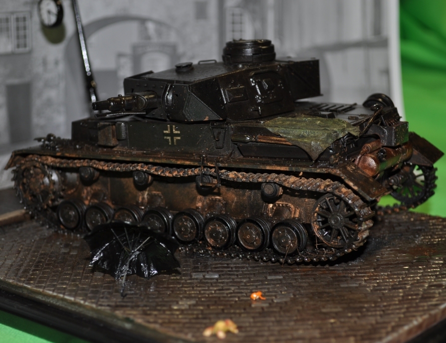 Танк изначально- был правильного цвета- панцер грей- от применения средств визуализации (лака)- потемнел... Смысл от этого в диораме - не потерялся.