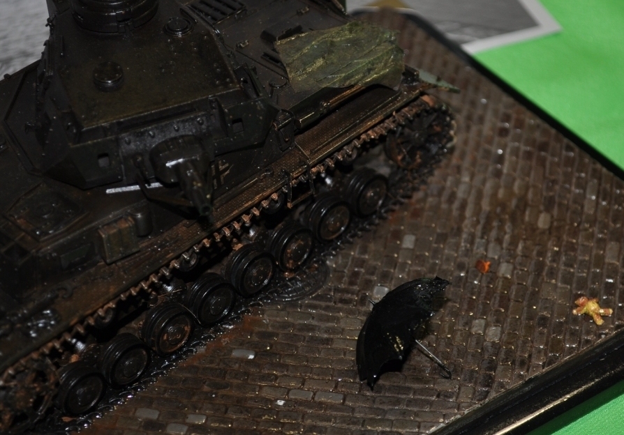Очень мало диорам без фигурок, которые передают настроение. С фигуркой проще- сгорбленная, сутулая спина- вот и уныние, усталость.... Вот пример такой же дождливой непогоды - http://www.diorama.ru/gallery/dioramas/3333/