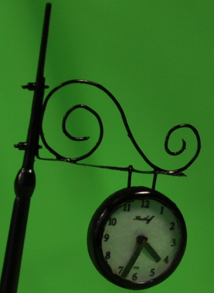 Танк, останавливаясь наехал на столб с часами- именно по этому столб покосился и часы (время ДО войны) сбились.