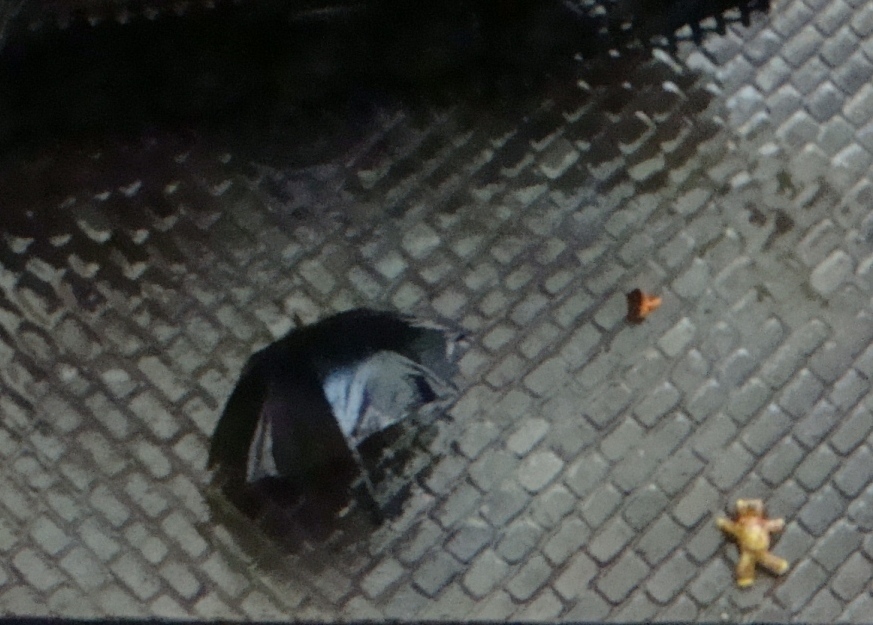днем, как вдруг увидели надвигающийся на них танк, девочка от увиденного уронила мишку, а отец бросив зонт и схватив ребенка на руки бросился прочь.
