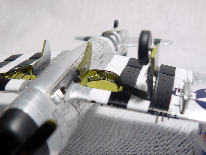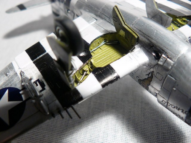Подошёл черёд модернизации заготовки. Готовая модель-первый мой продукт произведённый с помощъю IT-технологии. Большая часть информации и фотографий взята из и-нета. При изготовлении деталировки главную роль играли «волки» реальных самолётов. Сделаны подвижными рулевые поверхности оперения и элероны. Закрылки выдвигаются на штифтах из игл от суперклея, для того чтобы закрылки не «хлябали» туда-обратно штифты в крыле двигаются в пвх втулках (изоляция от провода) с небольшим натягом . Выбраны гравировальной машинкой подчистую ниши шасси и вставлено туда почти всё что можно воспроизвести в масштабе. Стойки и щитки так же получили свою порцию доработок. В кабине сделал новое кресло с ремнями из фольги. Приборную панель оставил прежнюю, заменил педали. «газ и тормоз 8-)))» Покрасив мелочёвку в кабине выдавил из плекса новый фонарь. Попробовал установить бронестекло из упаковочного пластика, но плексигласовый фонарь хоть и тонкий, свёл эту затею в разряд курьёзов. Жалюзи маслорадиаторов и интеркулёра из пивного дюраля. Переделал передний ряд цилиндров двигателя, добавил штоки толкателей проводку и раму крепления капота. Переделал подкапотный делитель потока между мотором и радиаторами. Расшив и склеив воедино планер, начал оклеивать его фольгой-самоклейкой. Как раз впору подошли советы коллег по матированию фольги -результат на фото. После оклейки и проклёпывания пришла пора окраски. Камуфлированные варианты от «академиков» мне не понравились, хотелось сделать что-то поярче. Сперва решил делать самолёт Данхема, но «Трубовой» его аж в двух масштабах «выдудил», да и статья на ресурсе http://ipmsstockholm.org ясности по окраске поубавила.