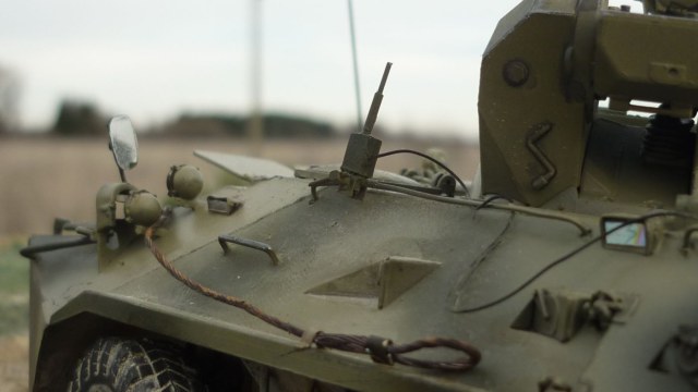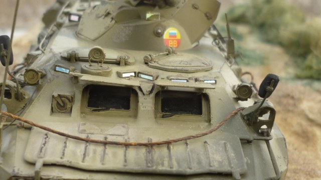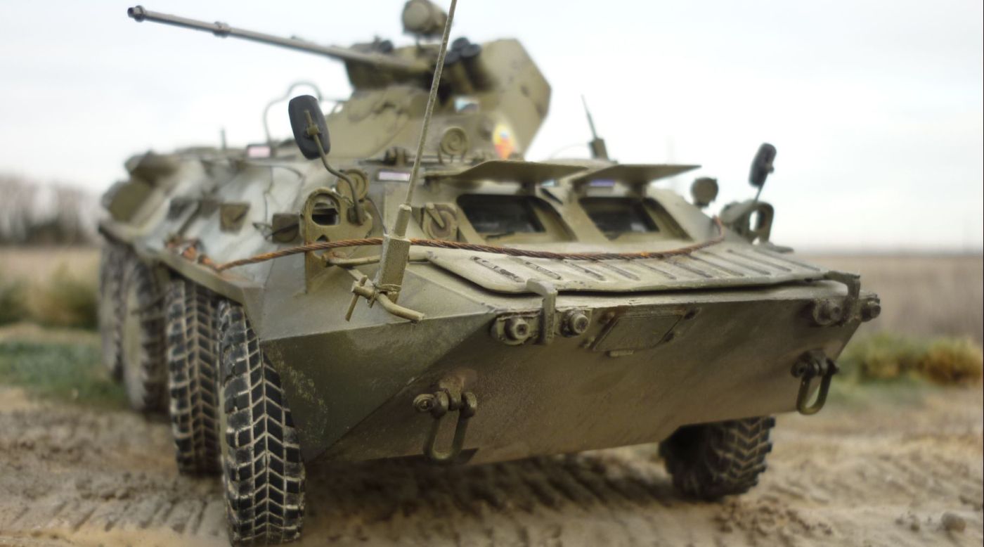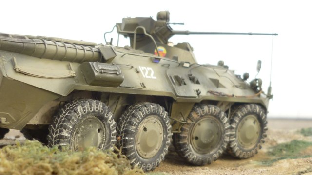Доброе всем время суток!Модель долго лежала на полке и вот наконец то собралась.БТР полностью из коробки с небольшими доработками.Красил тамией пигменты миг.Да, подставка от другой диорамы, поэтому бтр висит.