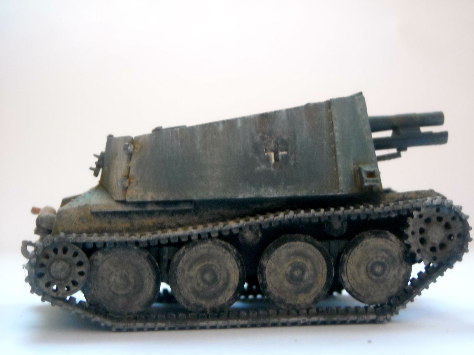 Хотелось сделать такой старенький танк, пытался сымитировать потеки. Смывка-масло, грязь-зубной порошок.