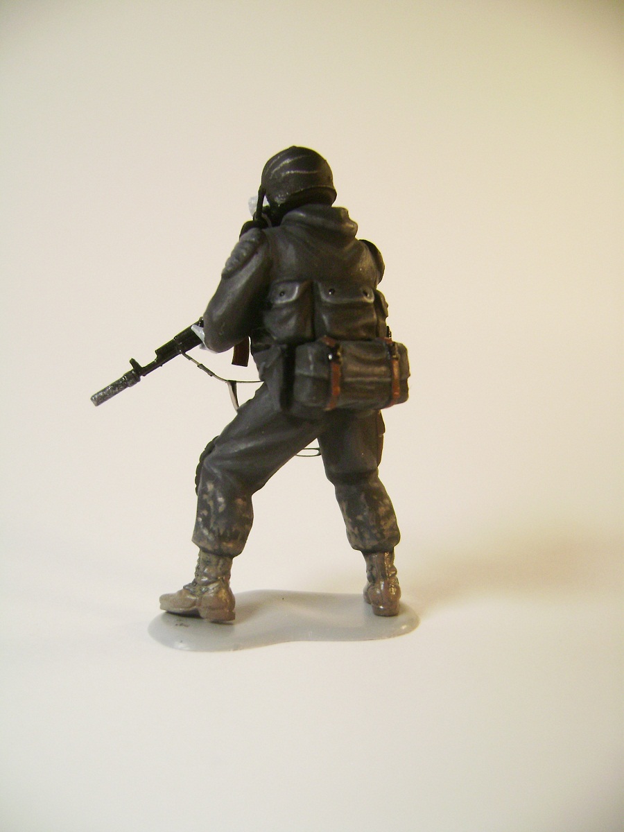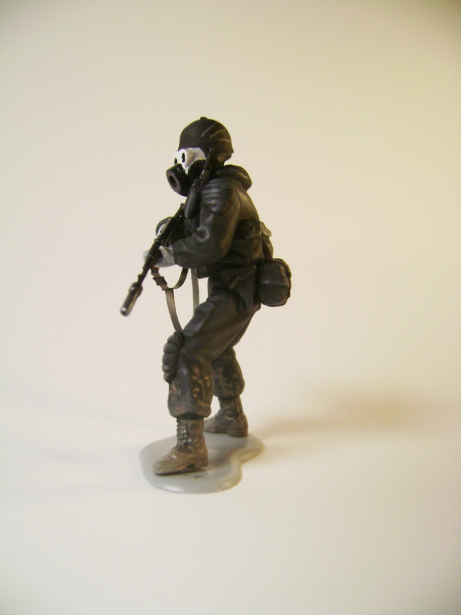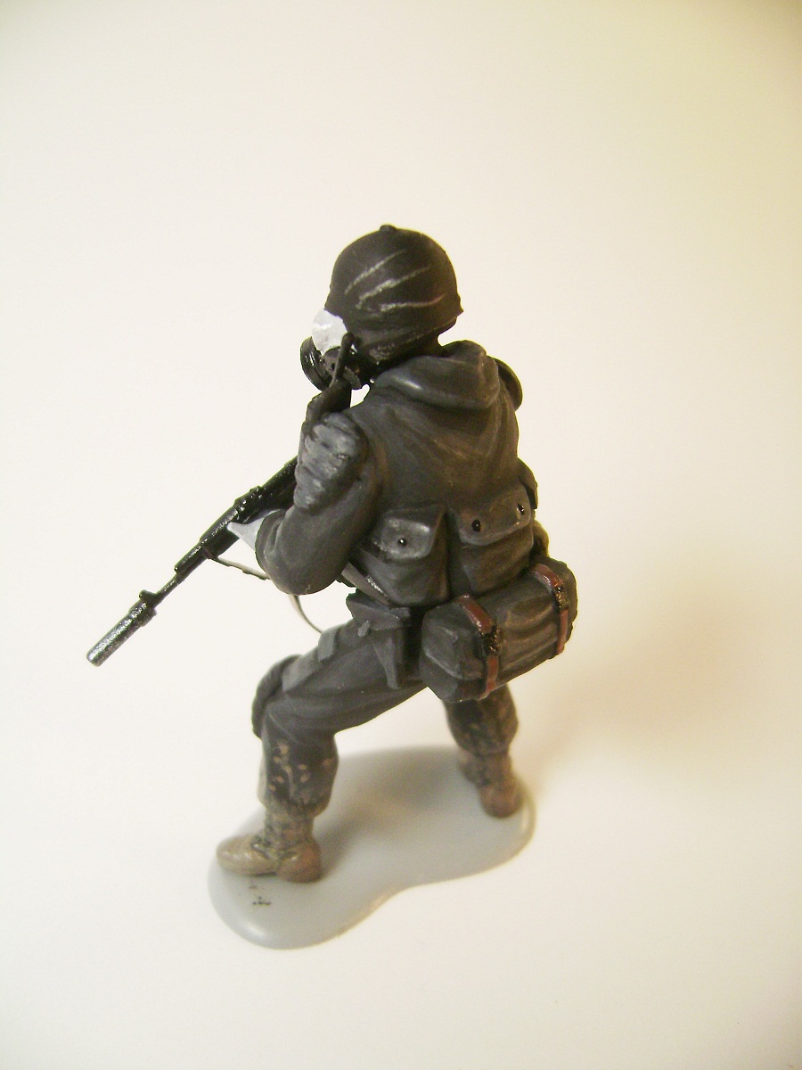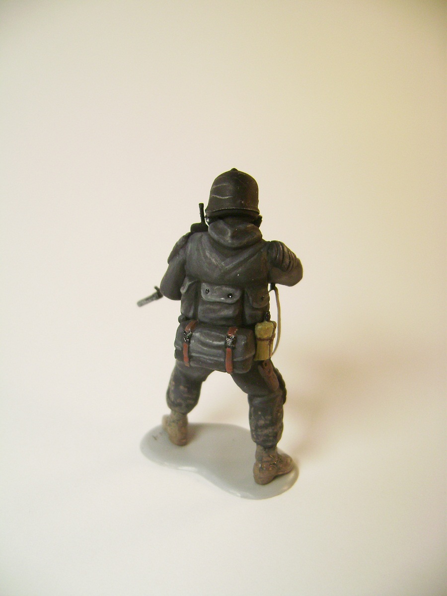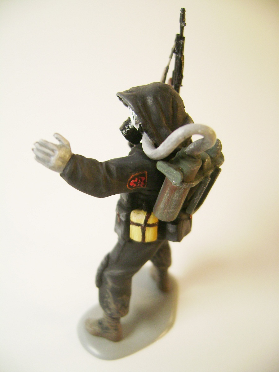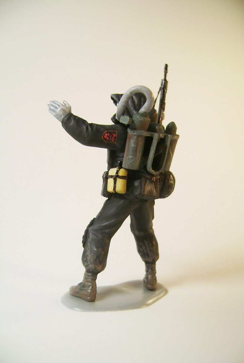 Основной цвет наносил из аэрографа, тона наносил кистью. Матовым лаком не покрывал, т.к. на предыдущей фигурке эта процедура дала еще больший блеск. Противогазы и сислородная система изготовлены из модельного мусора, ремни - фототравление от ф."Трумпетер".