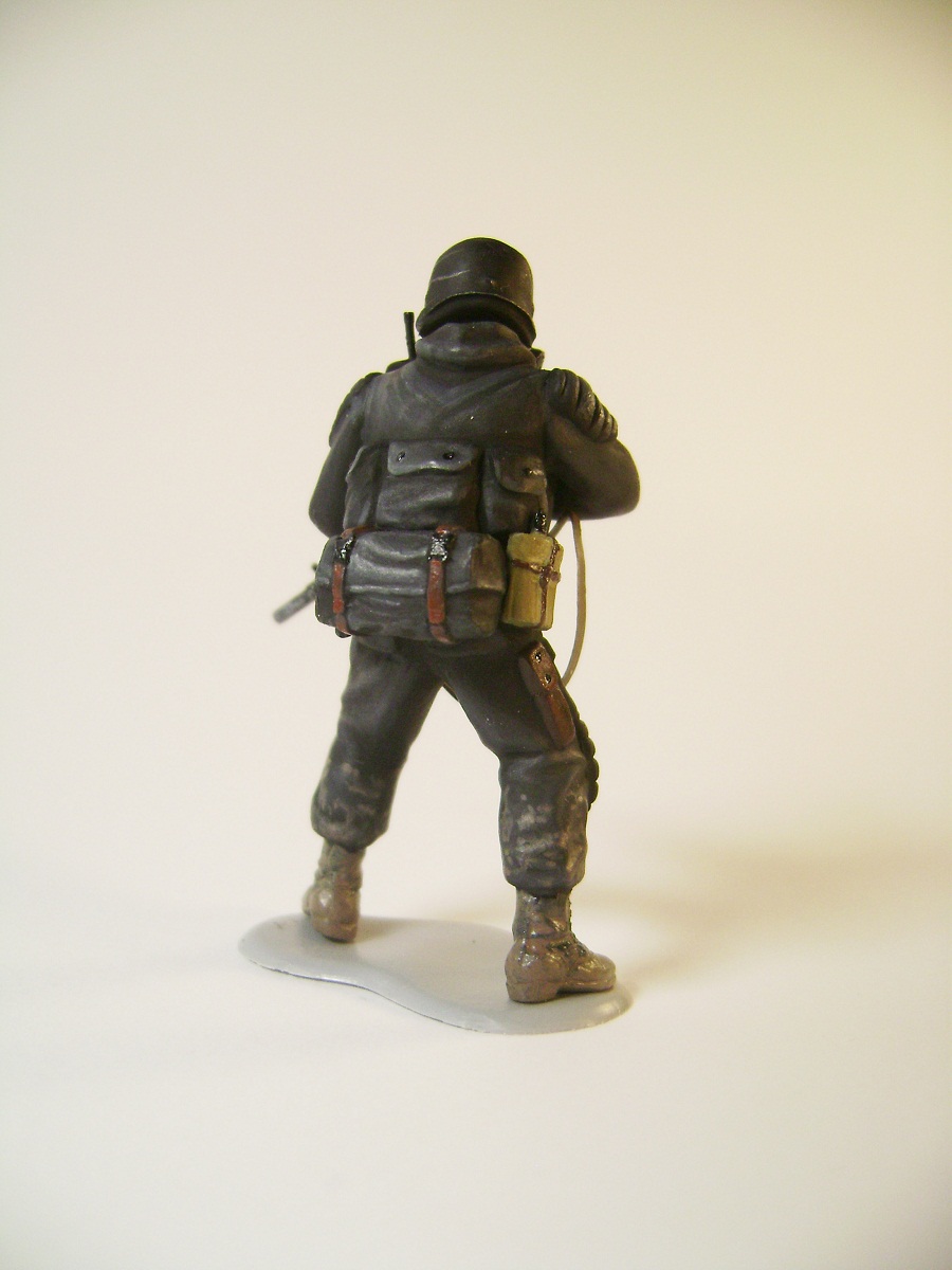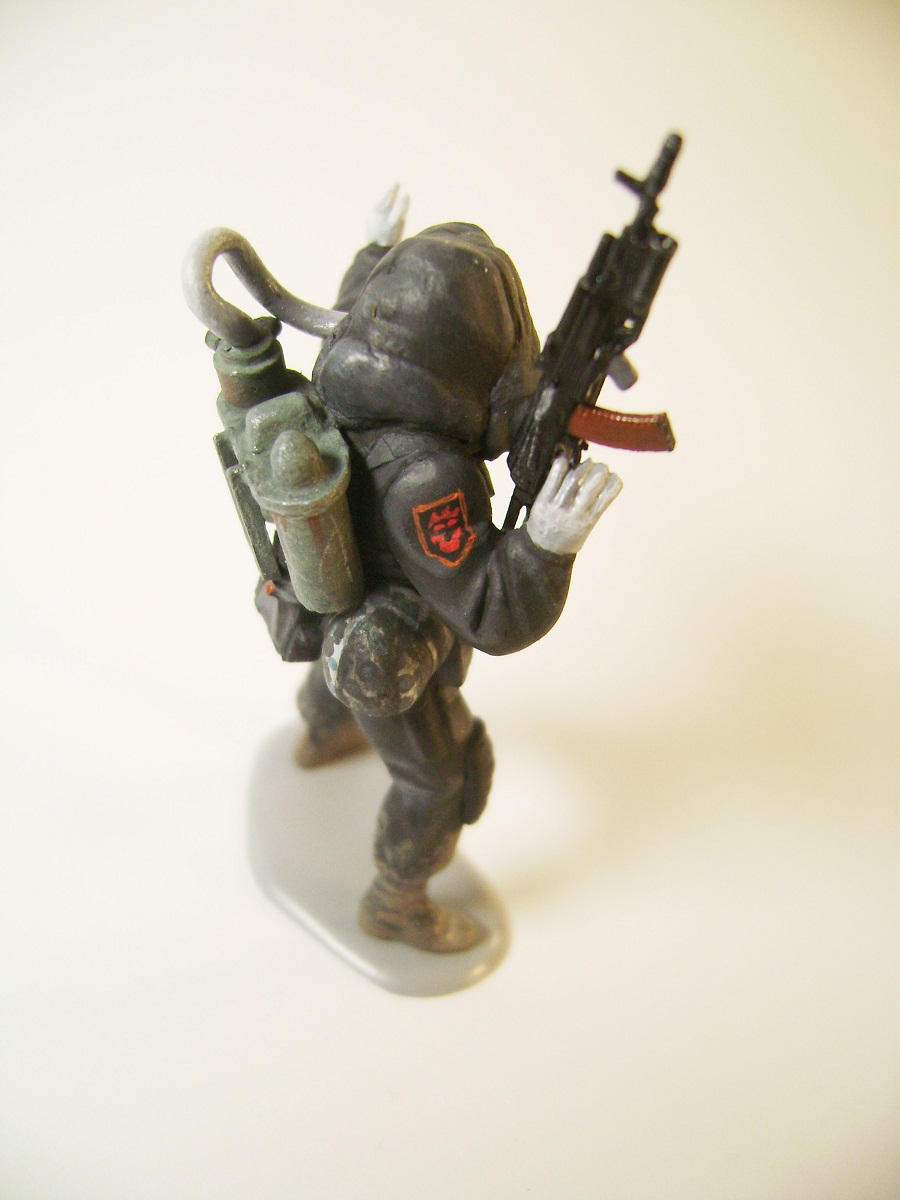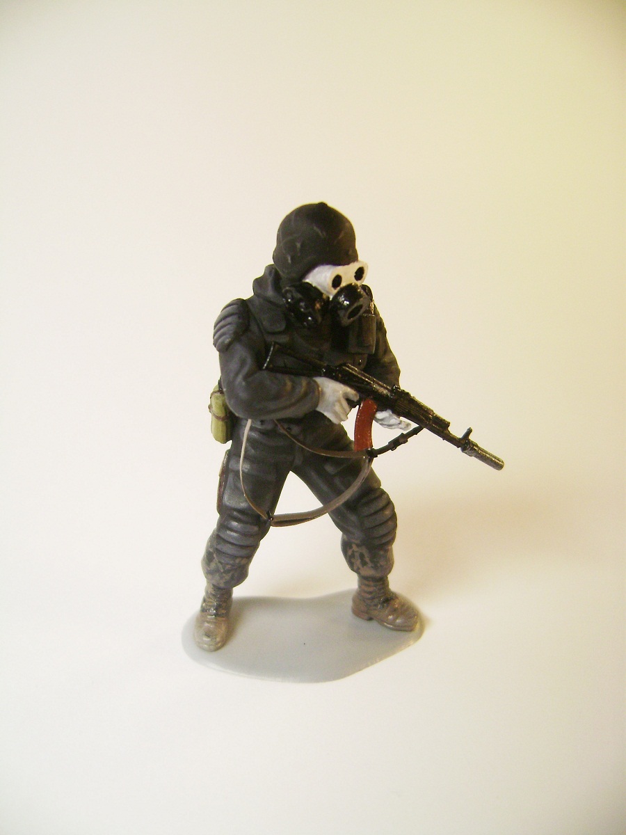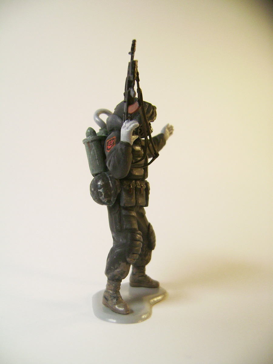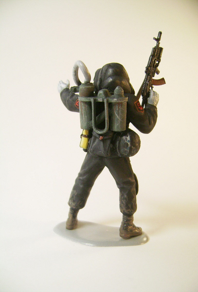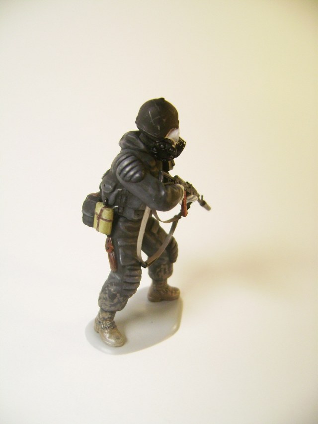 Основной цвет наносил из аэрографа, тона наносил кистью. Матовым лаком не покрывал, т.к. на предыдущей фигурке эта процедура дала еще больший блеск. Противогазы и сислородная система изготовлены из модельного мусора, ремни - фототравление от ф."Трумпетер".
