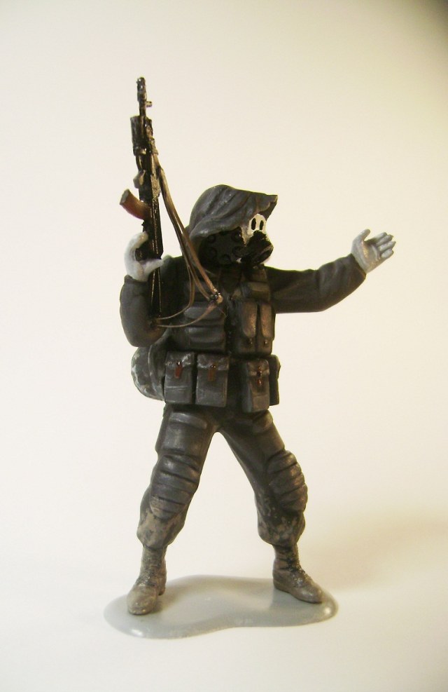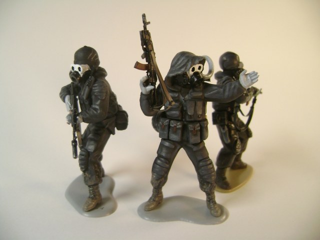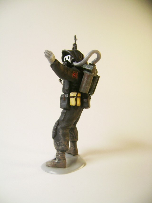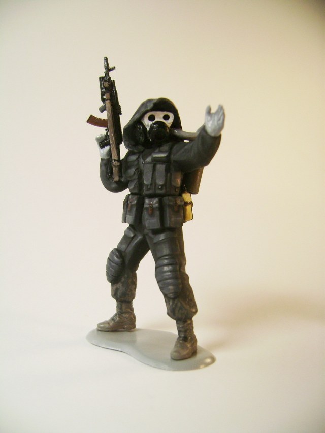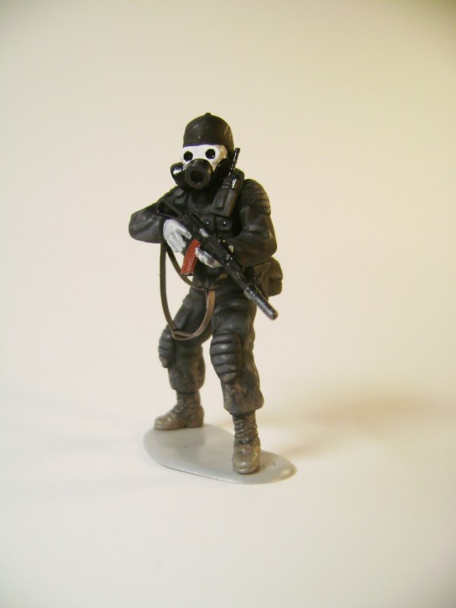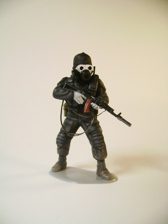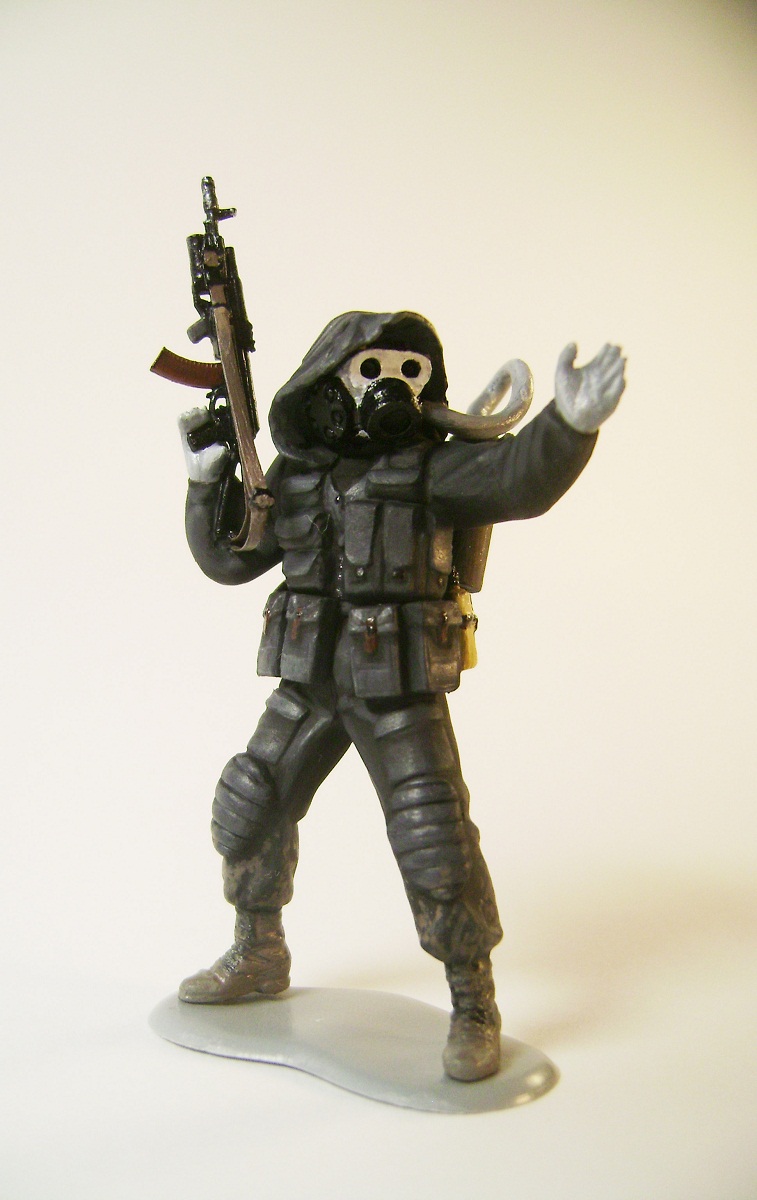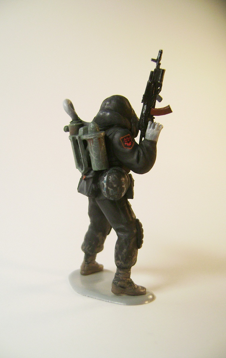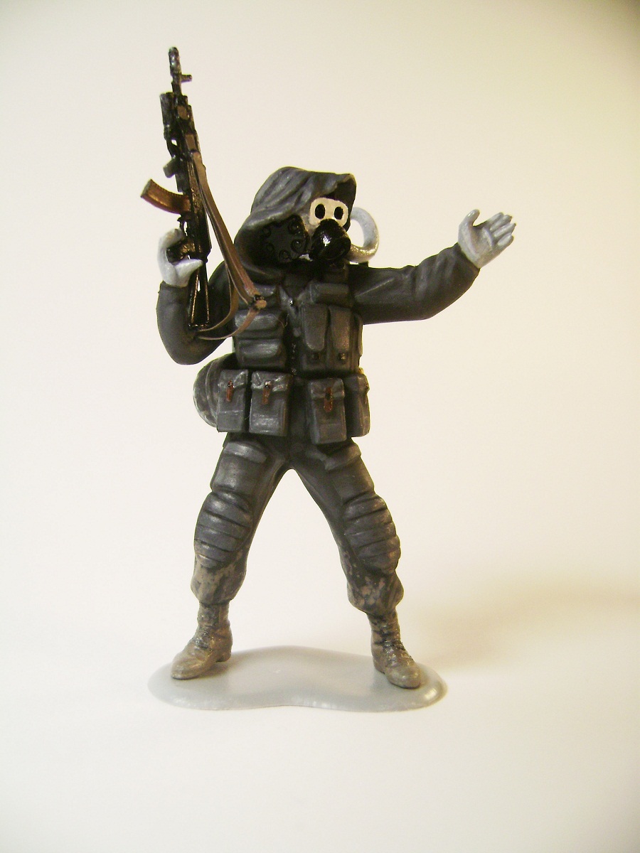 Основной цвет наносил из аэрографа, тона наносил кистью. Матовым лаком не покрывал, т.к. на предыдущей фигурке эта процедура дала еще больший блеск. Противогазы и сислородная система изготовлены из модельного мусора, ремни - фототравление от ф."Трумпетер".