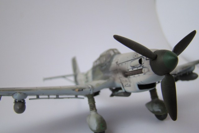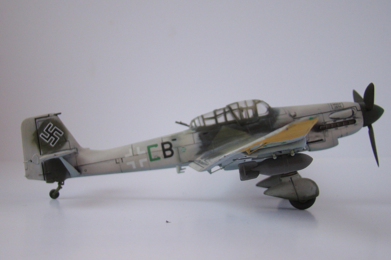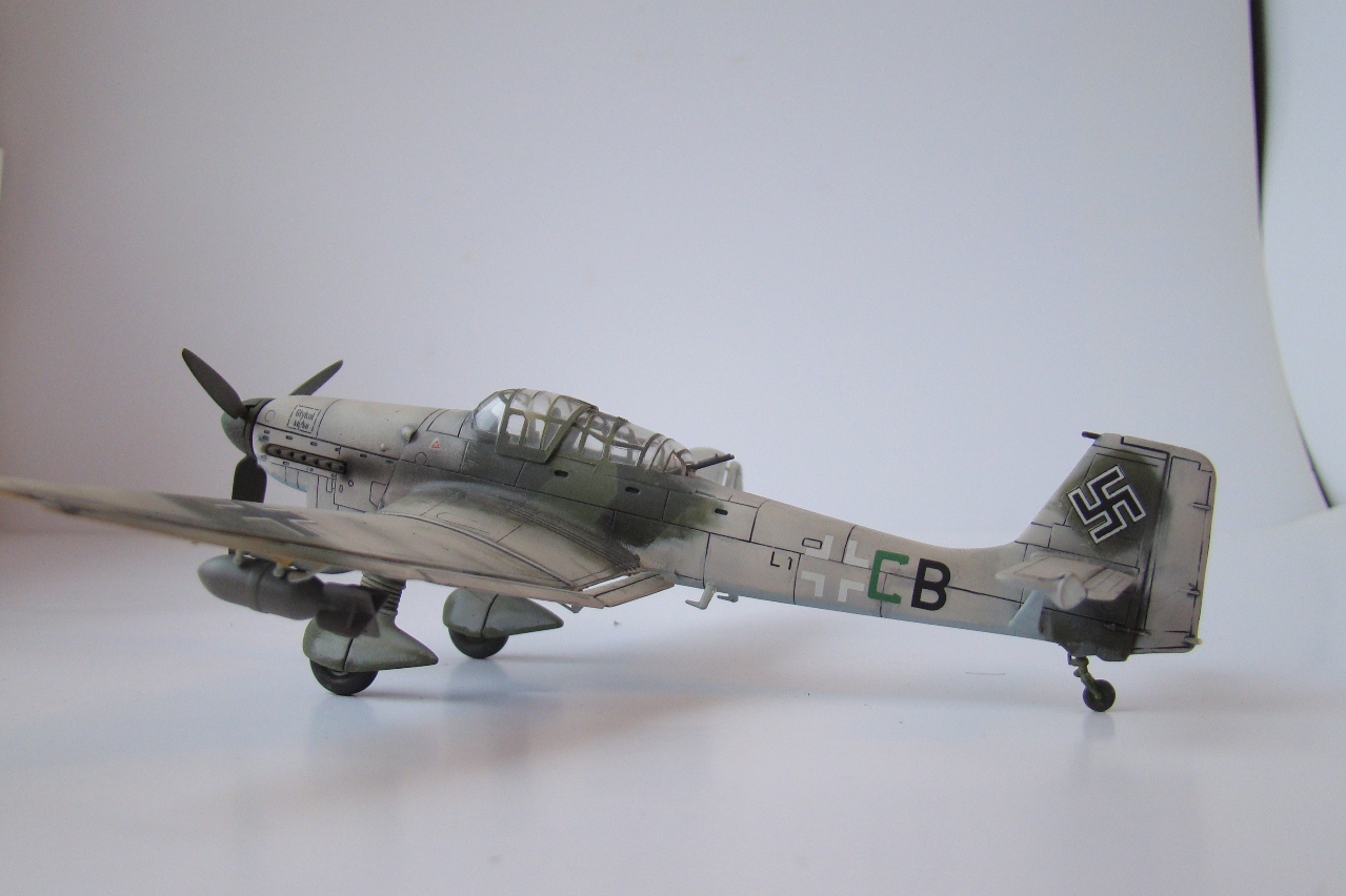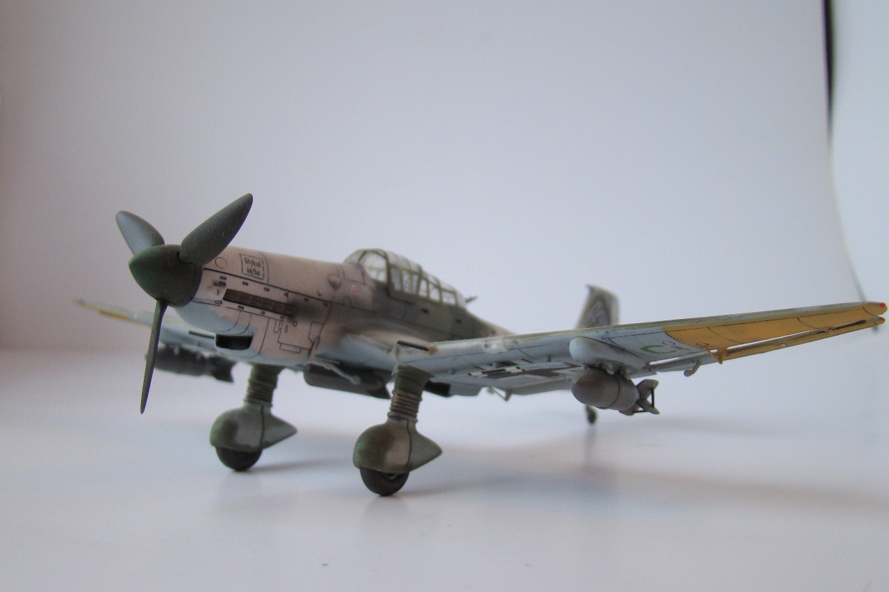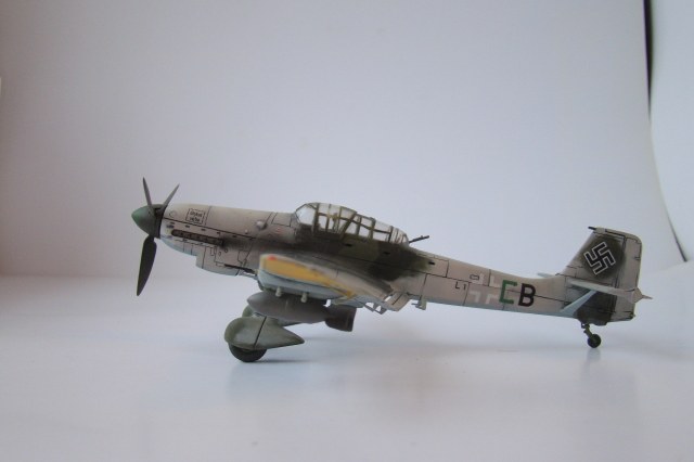 Прототип самолета всем известен, по кинохроникам второй мировой войны и ассоциируется с фашистами, как Мики-Маус с Диснеем (Во всяком случае у меня). А звук издаваемый данным сиреной, которая приводилась в действие потоком набегавшего воздуха, и производила вой во время пикирования, столько раз был услышан мной по ТВ в различных фильмах о Великой Отечественной Войне, что неразрывно связан с этой страницей нашей истории. Модель собиралась из коробки, без доработок, сам пластик понравился, тонкая внутренняя расшивка, стыкуемость хорошая. Самолет делался в зимнем камо, из «доработок» нагар. К сожалению антенна утеряна, а сделать новую руки не дошли.