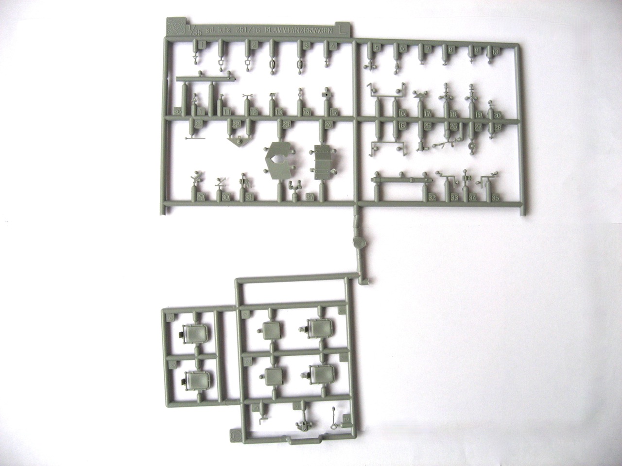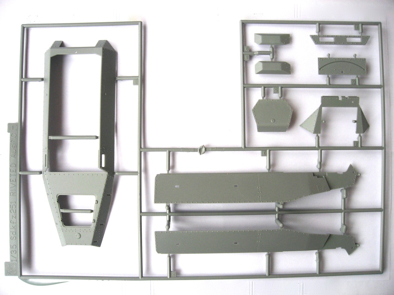 Сам набор, как обычно, набит огромным количеством деталей. Предлагается два варианта сборки: Корпус с заклепками и без. Есть не много фототравления. Три варианта окраски. Есть также резиновые фигуры водилы и огнеметчиков. Огнеметчиков делать не стал, какие-то они маленькие, по-моему не соблюден масштаб. А водила в поряде. Драгоновские наборные траки для 250ых и 251ых-лучшие. А-ля Моделькастен, только уже в наборе. Много декалей. Ну вроде все.