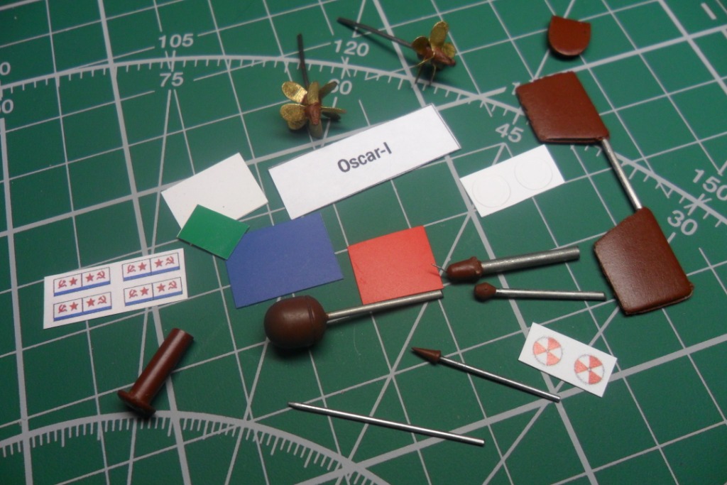 Допдетали поместились в маленьком пакете: носовые рули, винты, ВУ, наклейки кругов люков. ВУ из смолы отлиты вместе со стойкой, т.е. заморачиваться с поиском проволочек и игл нет необходимости. Cамая зачетная, на мой взгляд, вещь это гребные винты, они отлиты вместе с обтекателем, валом и лопастями в одно целое.