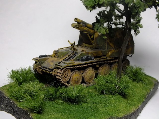 Модель неудачная и невезучая.Орудие не хотело становиться на своё место,пришлось пилить.В процессе сборки потерялся бесследно каток.Чтоб модель не пропадала решил поставить её на диораму.Это первый мой опыт строительства диорам.Так вот получилось.