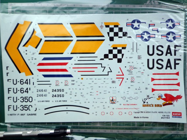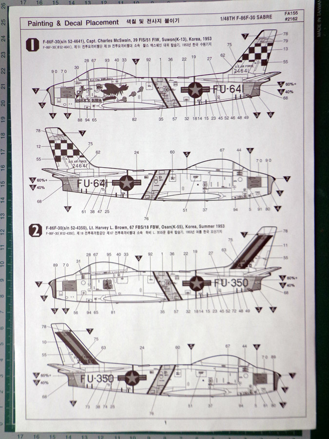 воздухозаборничек около тормозных щитков, что присуще только японским F-86F-30. Воздухозаборник неправильный у обоих. Обзор Тома Кливера здесь https://modelingmadness.com/review/korean/cleaver/usaf/tc86f.htm.