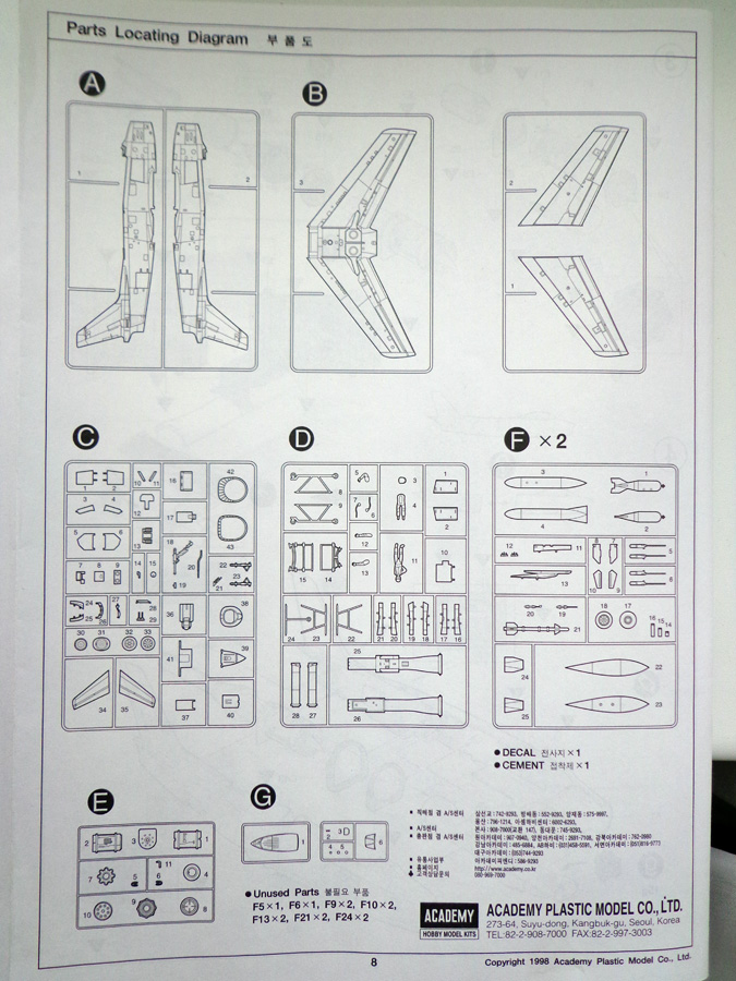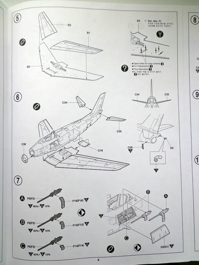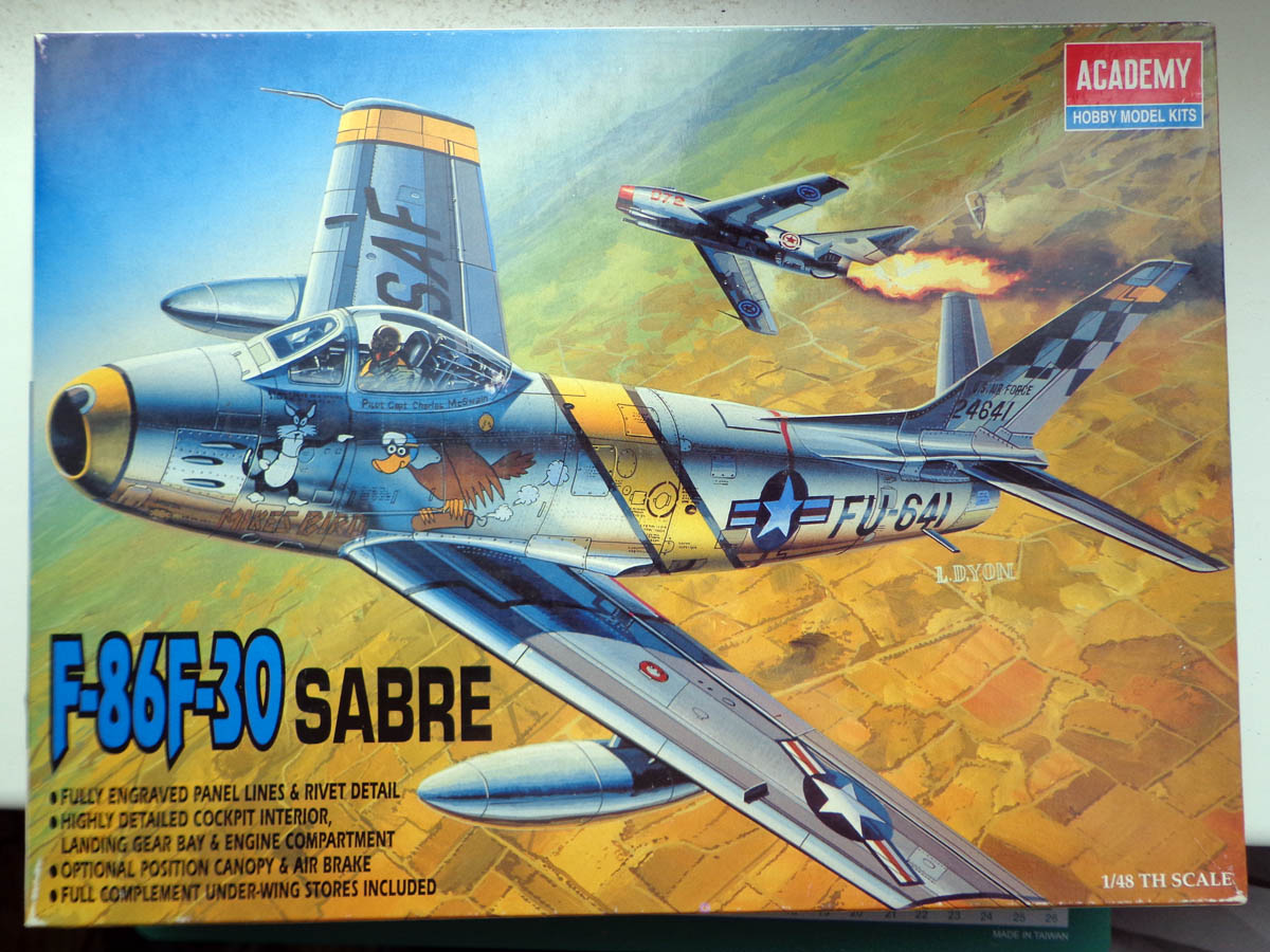 F-86 F-30 от AKADEMY. Набор производит приятное впечатление. Расшивка тонкая и аккуратная, детализация на довольно хорошем уровне, можно собрать модель в "распушенном" виде, открыв двигатель, крышки отсеков вооружения и тормозные щитки. В комплекте идут две фигурки пилотов, одна в полный рост, фторая для кабины. Кресло лучше будет заменить (лучше всю кабину). Облоя очень мало, кое-где видны следы толкателей. Вооружить самолет можно как ракетами так и авиабомбами, так же есть ПТБ. Декали на два варианта, имеется техничка. Инструкция как всегда у академии на корейском и английском языках, но вполне понятная. В магазине сравнил Сейбры от академии и италери, италери очень не понравился.