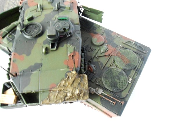 Танк вроде бы обрел свои формы и я приступил к работе с различного рода химикатами... Задул все грунтом от Тамии белого цвета, что в баллонах и оставил сохнуть. Затем настал черед тех же баллончиков от Тамии только уже с краской цвет Nato Green. Этот цвет стал базой... Расход химии в баллонах конечно дикий, но качеством я вроде доволен. Когда все схватилось, я взял в руки кисть и тамиевский акрил и начал наносить камуфляж (цвета nato black и nato brown). Все той же кистью и тамиевским акрилом окрасил всю мелочевку, гуси красил акрилом вальехо намешав цвет из терракота и стального. Потом задул модель полуглянцевым лаком из тамиевского баллона, так как глянцевого я нигде не смог достать. Лак подсох и я приступил к смывке специальным раствором от той же Тамии Pannel Line Accent Color на основе эмали и задул уже матовым лаком все это добро. Затем прикупил несколько туб масляной краски фирмы Гамма и начал впервые пробовать делать тонировку. Разводил масло слабопахнущим разбавителем от Сонет. Сперва испытал в том месте где ее не будет видно. Вроде все вышло неплохо и тонировкой прошелся по все модели. Затем была сухая кисть с серебристым хромом, пару движений кистью с черной краской и финальный слой матового лака. Дело осталось за малым. Сделал минимально брызг наподобие грязи намешанной гуашью и припылил модель тертой пастелью. Выставляю результат на всеобщее обозрение и естественной на конструктивную критику. Надеюсь в моих работах хоть какой-то прогресс заметен!)
