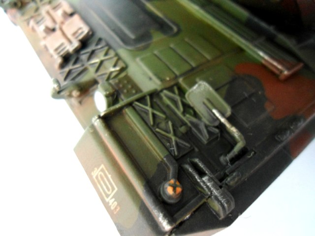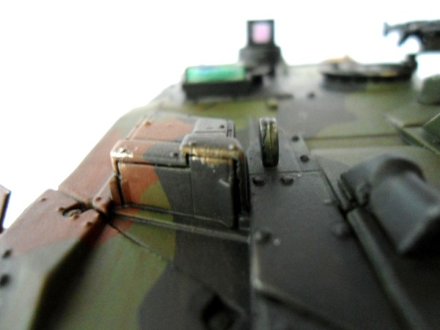 Изначально траки были заменены на наборные от бронко, которые при первом знакомстве слегка меня напугали количеством деталей. Как говорится, глаза боятся, а руки делают... Стоило взяться и работа закипела. Их я собрал за дня 3-4 и отложил в долгий ящик. Взялся за сборку самого агрегата. В процессе сборки подогнал триплексы из дивиди диска, попытался что-то сделать с крыльями лобовой брони (если можно так назвать, прошу прощения у тех кто разбирается в матчасти современной техники)... Я перерыл интернет в поисках информации о леопардах, уйму страниц на разных языках (благо учусь на международника и знаю 3 языка), но вот немецкий в данный список не входит и как правильно перевести различные термины я не знаю. Что-то я отвлекся, извиняюсь!