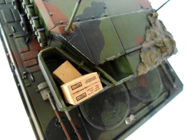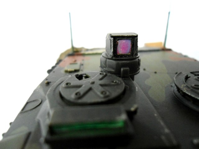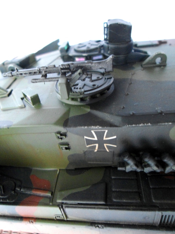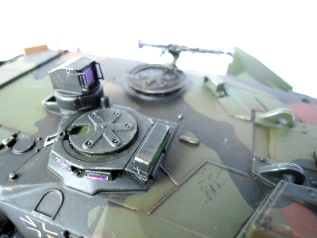 В некоторых местах наблюдается перебор с сухой кистью (серебрянкой). На рыме башни замечен неудаленный шов. Ручки на корпусе можно было заменить на проволоку. Смывка имеется, к сожалению, не везде. Не совсем понятна причина возникновения ржавчины на беговых дорожках гусениц (они, насколько я знаю, резиновые). Кромка зеркал заднего вида, кажется, черной должна быть. Гусеницы недостаточно прилегают к ведущим колесам. Корпус и башню можно было запылить чуть сильнее. Справа наблюдается небольшая щель между кормовой плитой (решеткой) и бортом корпуса. На корме (над камерой заднего вида) можно было бы и габарит добавить. Кормовые брызговики можно было бы и немного сточить - они слишком толсты. Не видно, высверлены ли стволы пулеметов. На корме нет традиционных буксировочных тросов.
