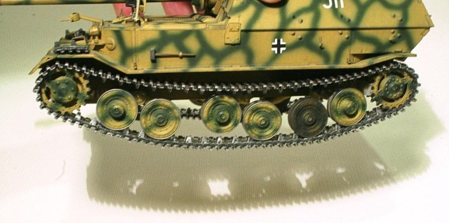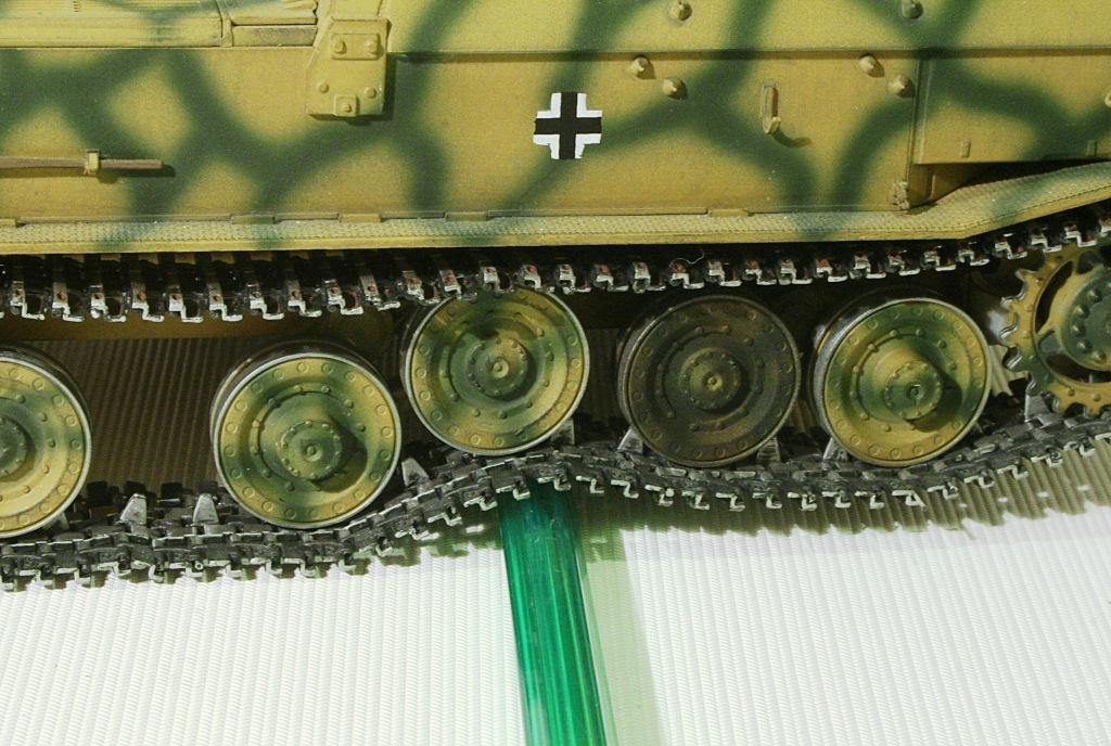 Крепления крышек люков просверлены 0,1 мм сверлом и продеты проволокой, что позволяет открывать и закрывать люки (с целью возможной посадки фигур экипажа). Ходовая подвижная. Траки просверлены и скреплены тонкими пластмассовыми «пальцами», что позволяет ходовой принимать рельеф местности на диораме.
