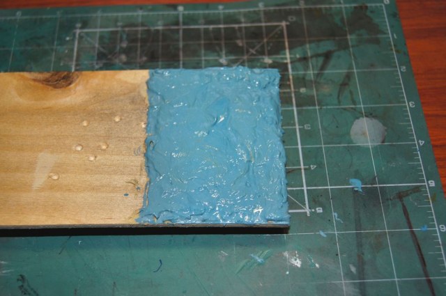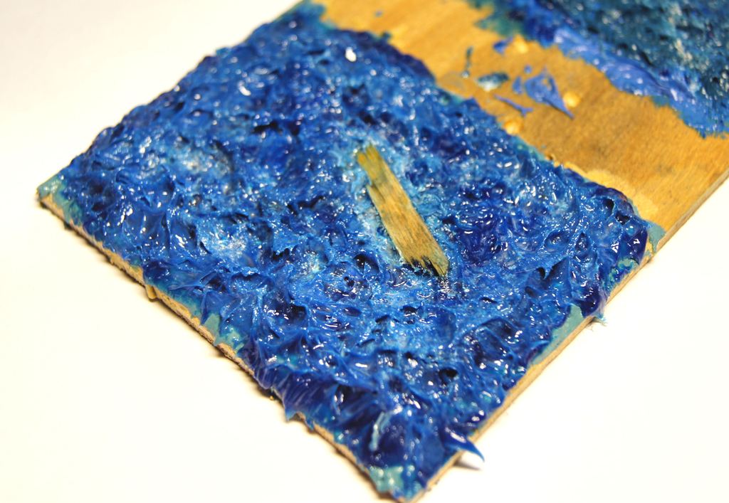 Замешиваем герметик с гуашью (я использовал голубую тёмную, светло синюю и белую) , вываливаем всё это дело на уже подготовленную фанерку с выкрашенной основой.