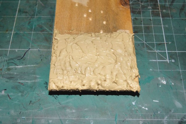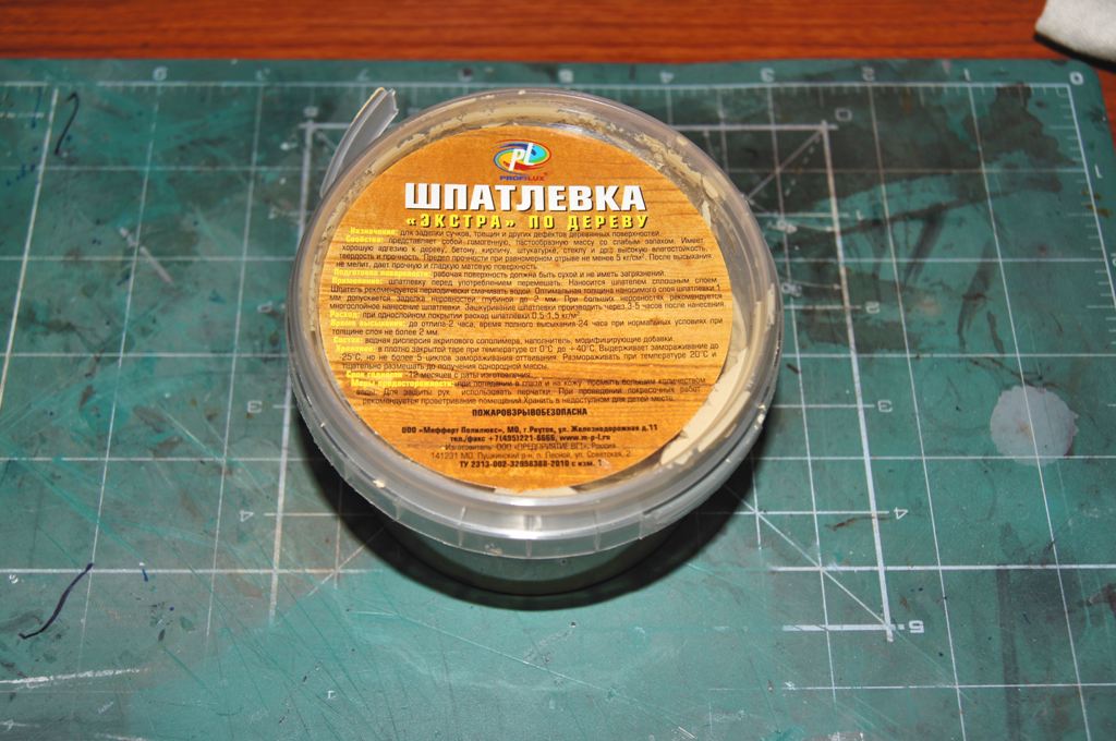 На него с помощью остатков веера наносим слой шпатлёвки по дереву.