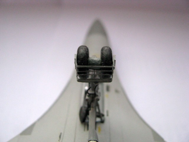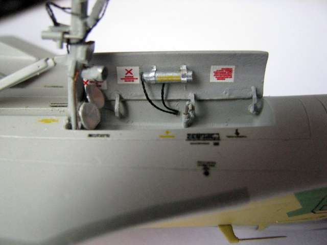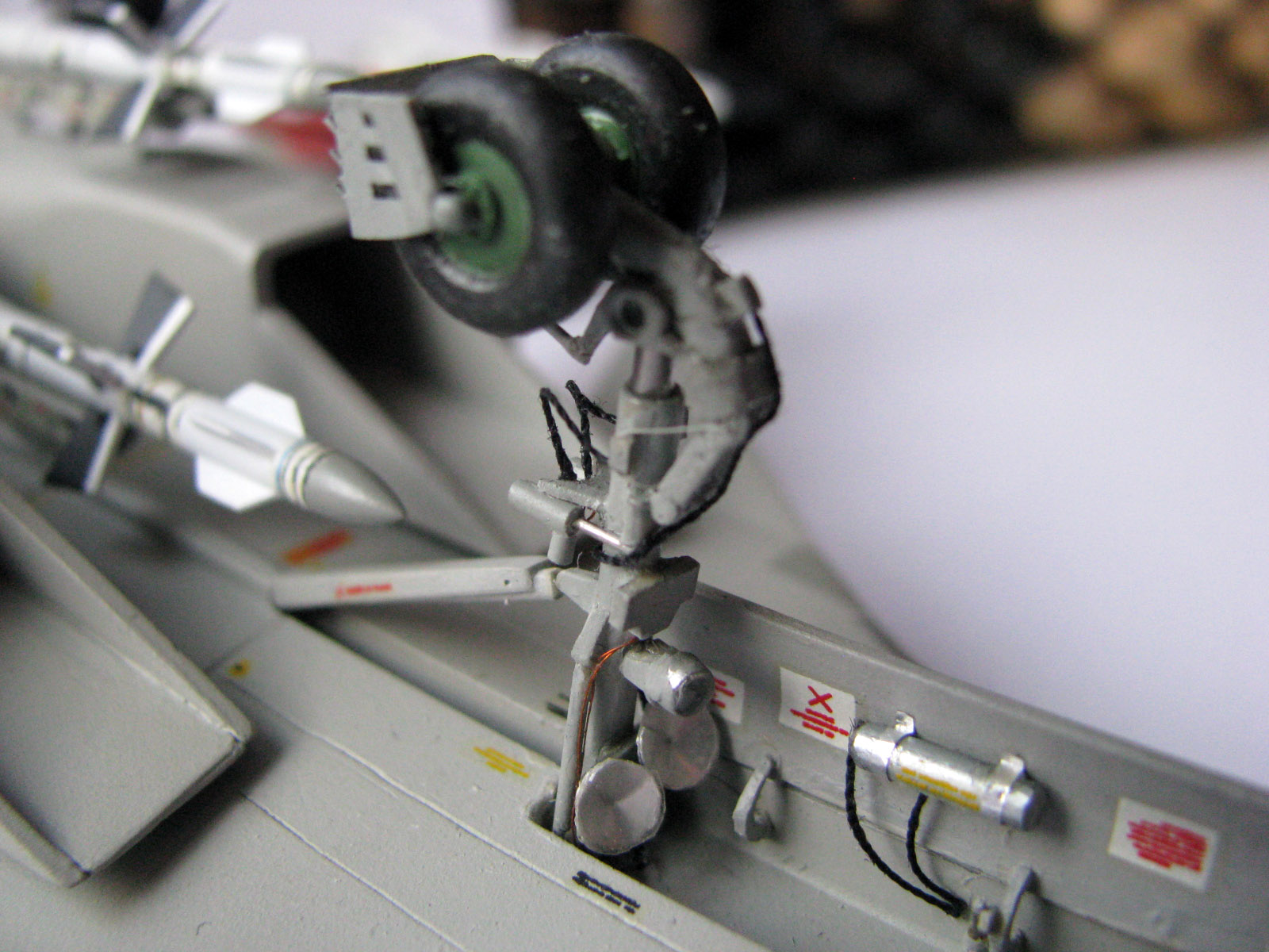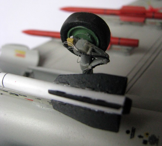 Я задумался о проводке в нишах шасси и о проводке на стойках. В итоге, хоть это было уже и неудобно, да и не вовремя, но я решил сделать хоть какую-то проводку. То, что получилось, Вы можете видеть на фото. От передней стойки, которая шла в наборе, была оставлена лишь маленькая часть (вилка, к которой приклеиваются колёса). Всё остальное изготовлено из подручных материалов (иголки, грифель карандаша, кусочки литника и пластика, проволока, нитки, баночный алюминий, сверло). Основные стойки шасси были немного доделаны.