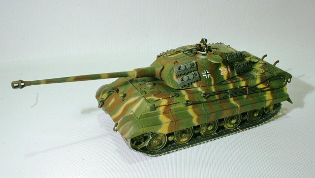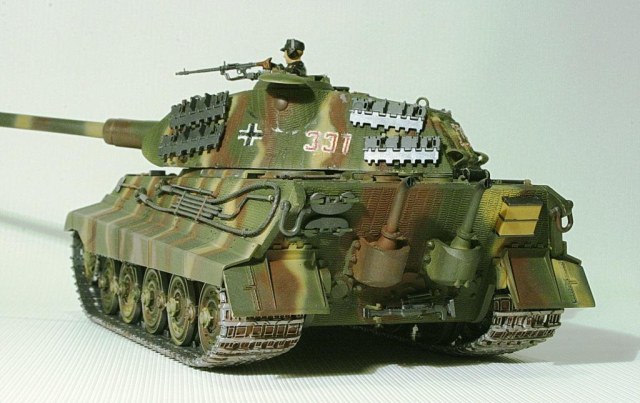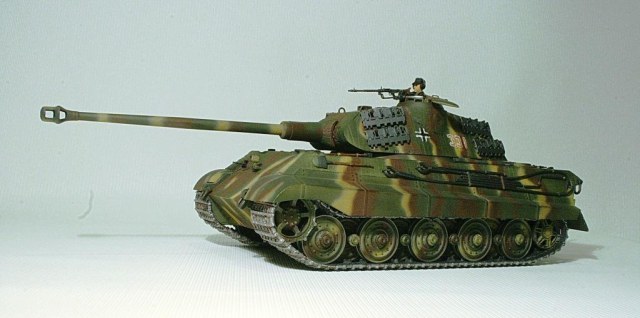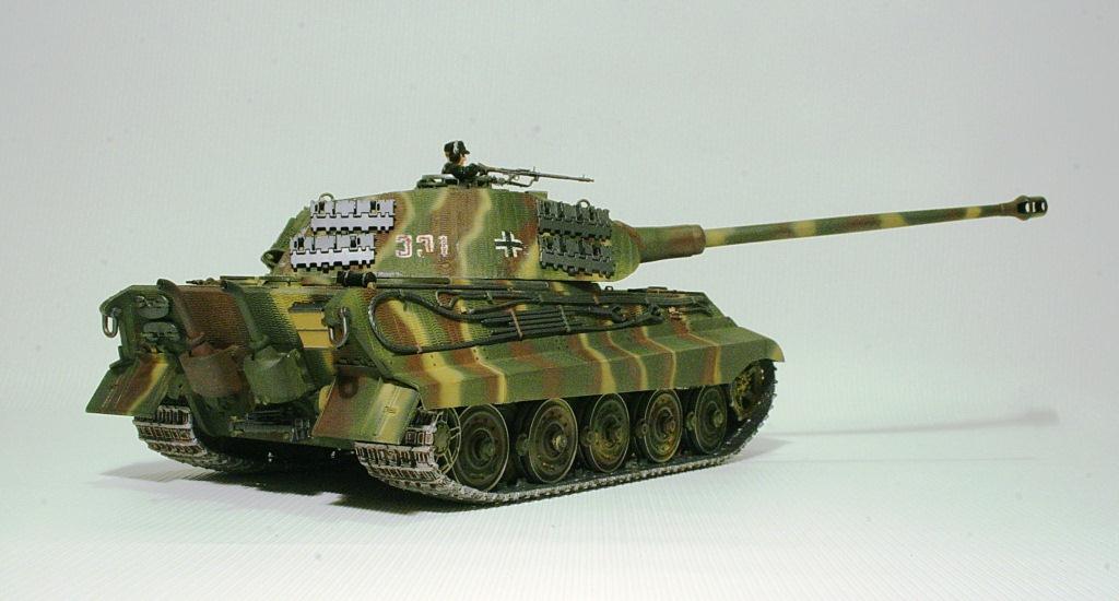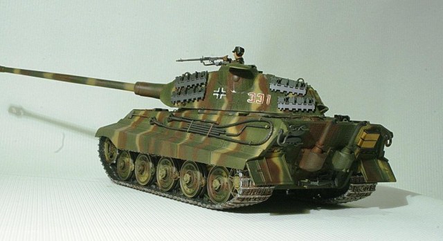 Боевая машина 503 тяжелого танкового батальона, Нормандия, июль 1944 года. Трехцветный камуфляж, в некоторых местах слезший и отколовшийся циммерит. Сколы и сломы циммерита от попаданий и рикошетов снарядов, пробитие надгусеничных экранов. Циммерит наносился вручную.