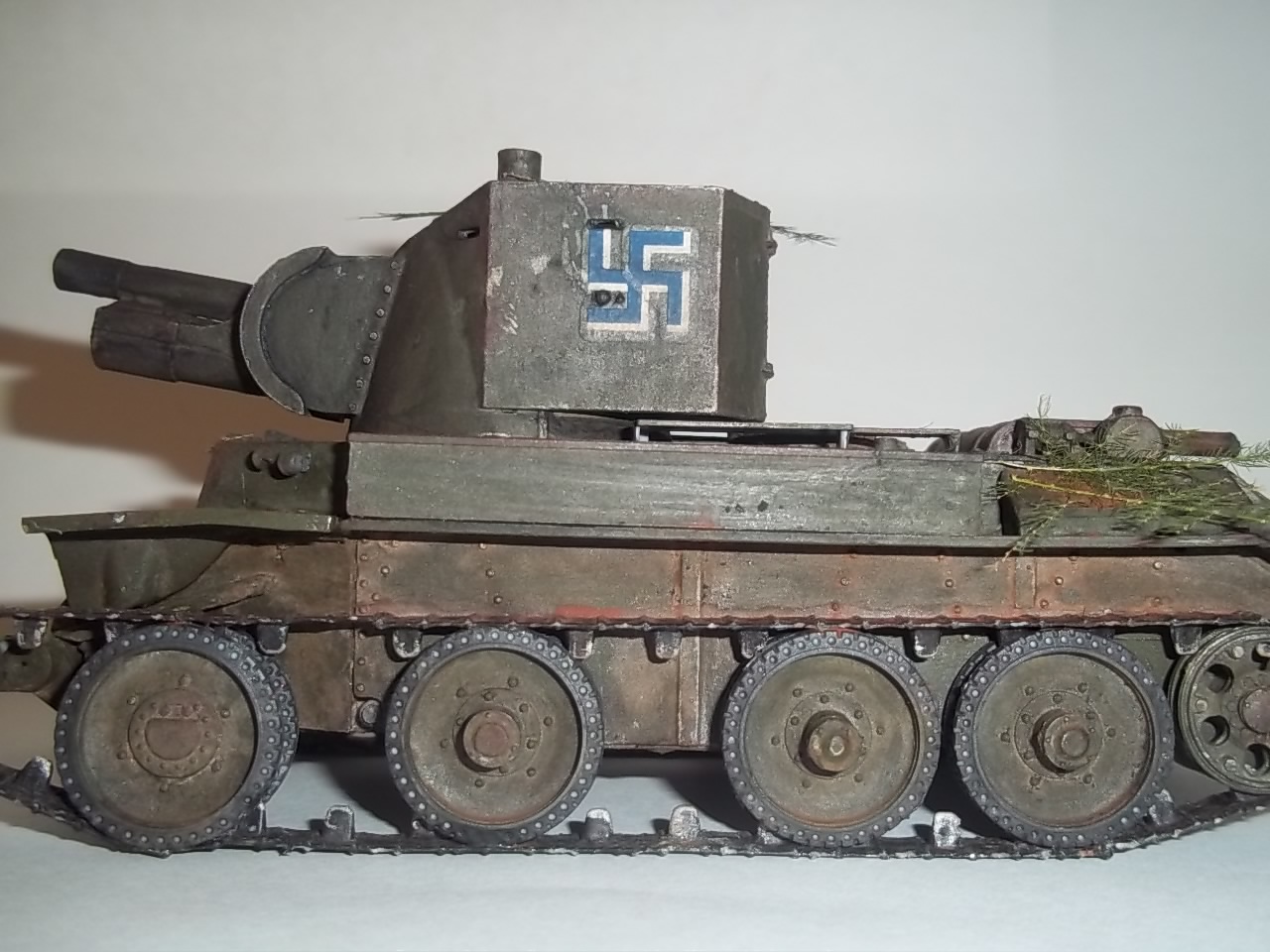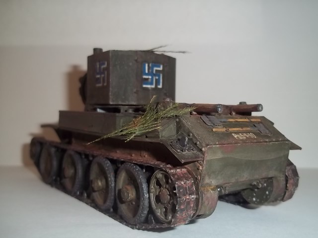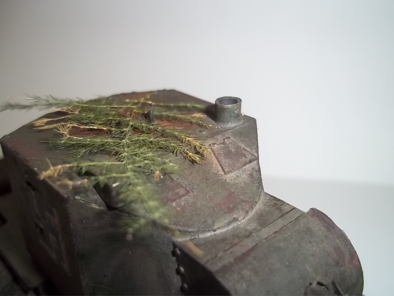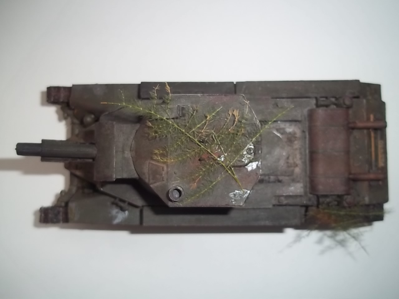 Ну не знаю, мне эта модель понравилась, (Почему то она напоминает мне КВ 2 из серии бт) Окраска неполохая. Только мне кажется, что ветки смотрятся как то не в тему, и топор слишком уж чистый, и яркий. Лично я не люблю большое количество шансового инструмента на танке. И если я его делаю, то делаю его почти невидимым. А с крыльями сделайте так: попилите их, помните и с имитируйте будто они повреждены. А затем покрасьте в цвет танка.