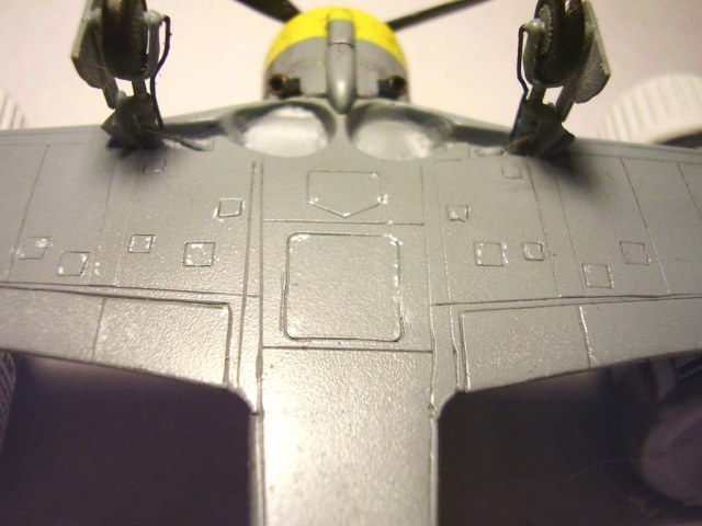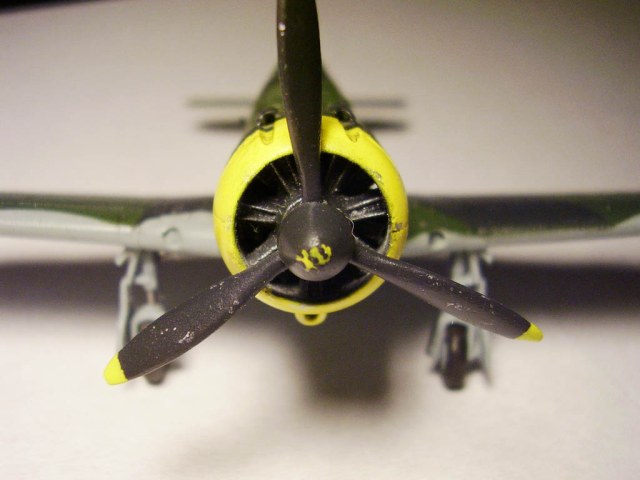 Модель смотрибельная, труда вложено множество. Недостатки, конечно, имеются. Кроме шагрени (чем и мои модели зачастую страдают) Мне бросились в глаза форма и цвет "черепушки" на коке. Не знаю, кто эту деку делал (или сам рисовал?), но с цветом явная ошибка. На последнем ч/б фото явно видно, что "черепок" белого цвета, даже если сравнивать не с цветом капота (который удален), а с концами лопастей (которые имеют тот же уровень освещения). Да и вообще, кто это видывал желтый череп?