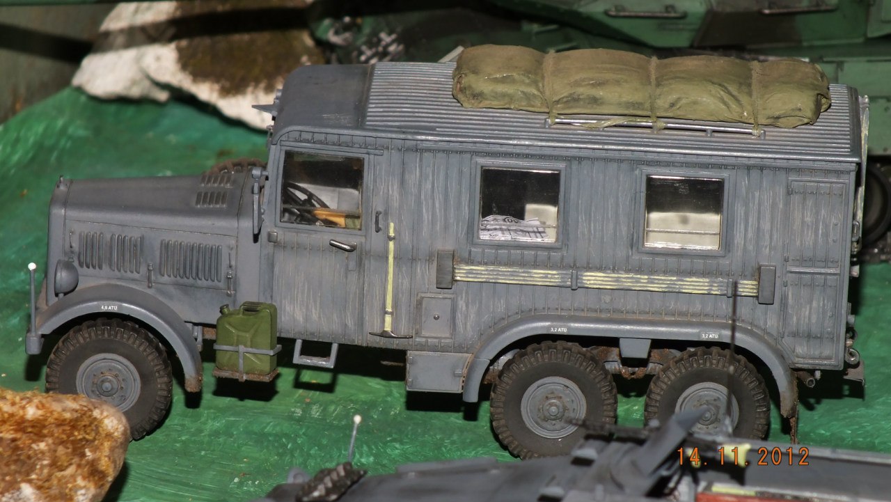 Машина телефонной связи на базе типового Германского грузовика Айнхайндизель.Это стандартный армейский грузовик выпускался почти всеми заводами Германии.Разработка МАН. Модель хорошего качества и прекрасно собирается.Вот только много отклонений от оригинала,сужу по фото из книги,,Полный каталог военных автомобилей и танков Германии 1900-1982г.г.,,Переделал подножки,стремянку,поручни,багажник на крыше.Добавил инстр.ящик между з.колёсами,фары на указателях поворота,знак прицепа,фиксатор з.двери в откр.положении - около 30 переделок.Открыл одну дверь,они просто нарисованы.Посадил шофёра. Оформил в своём стиле-машина ещё новая,но уже побывала в переделках.На фото она слишком голубая,действительно она серая.При фотографировании в следующий раз совсем убавлю цветность в аппарате.