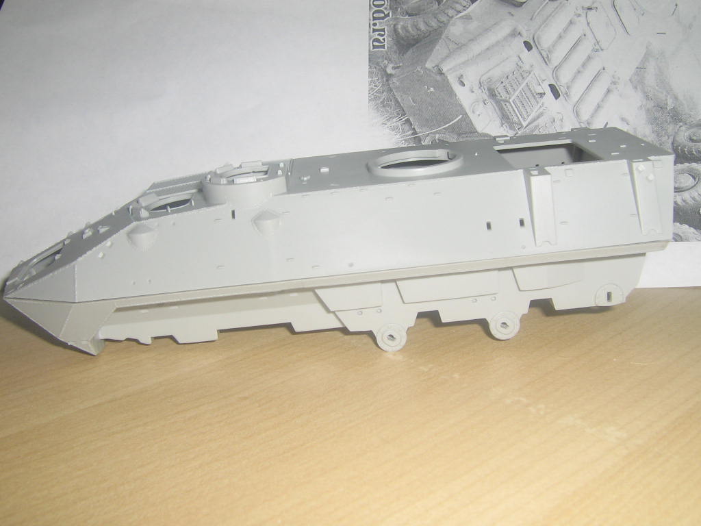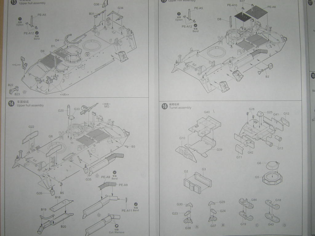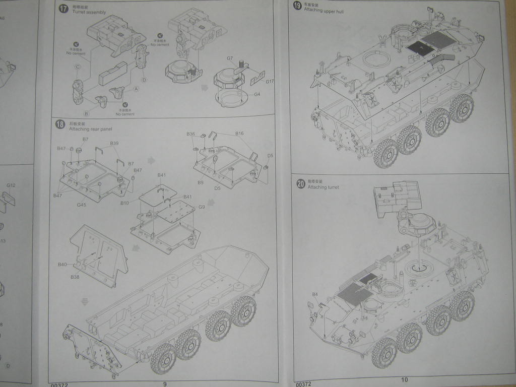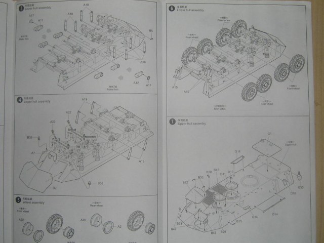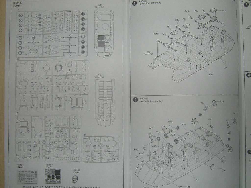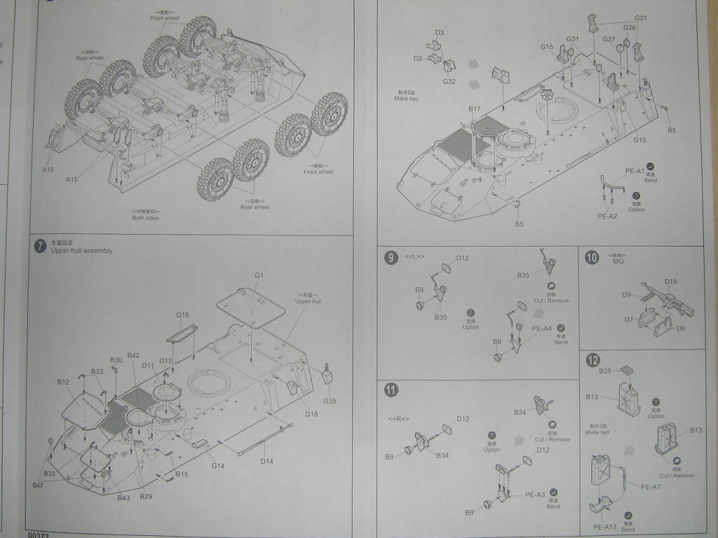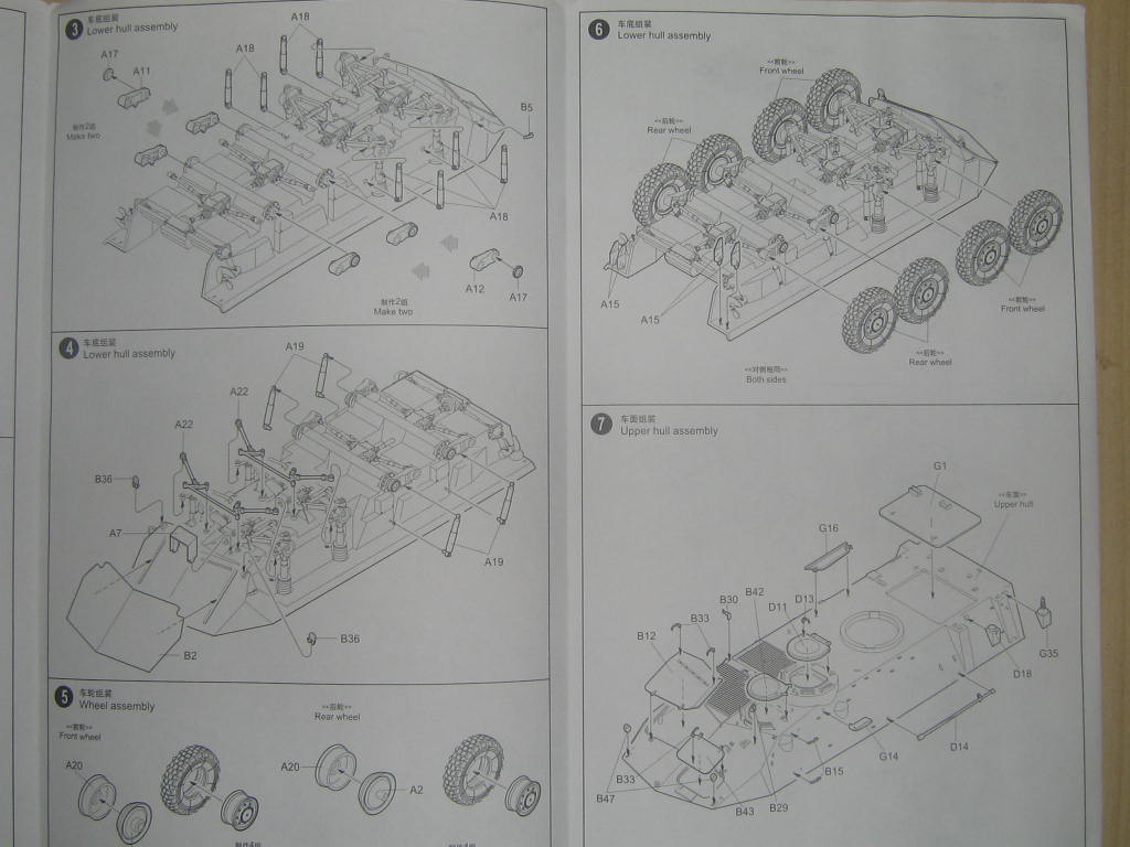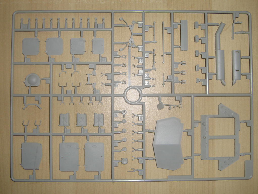 литники,колёса, рамка фототравления, декаль.(всё упаковано в о дельные пакеты!). при тщательном осмотре толкатели были обнаружены(слава богу только с тыльных сторон деталей), утяжин нет и ( радости моделиста: -облоя тоже нет!:) ). Очень хорошо читаемая инструкция и цветной листок вкладыш с камо данного БТРа.