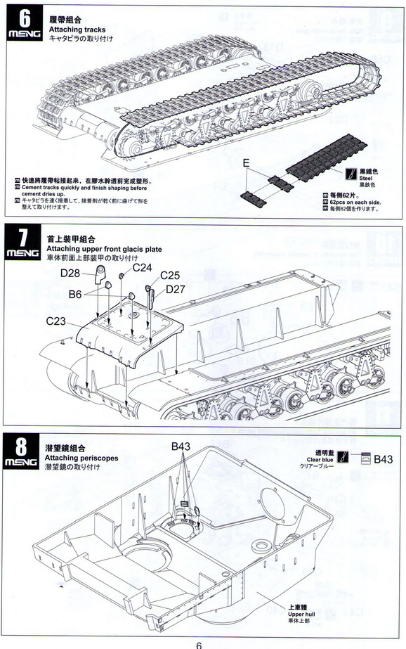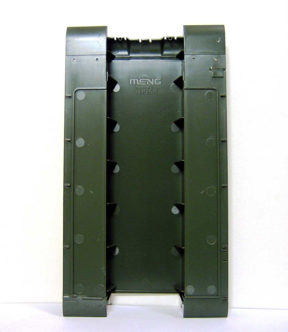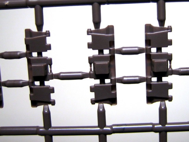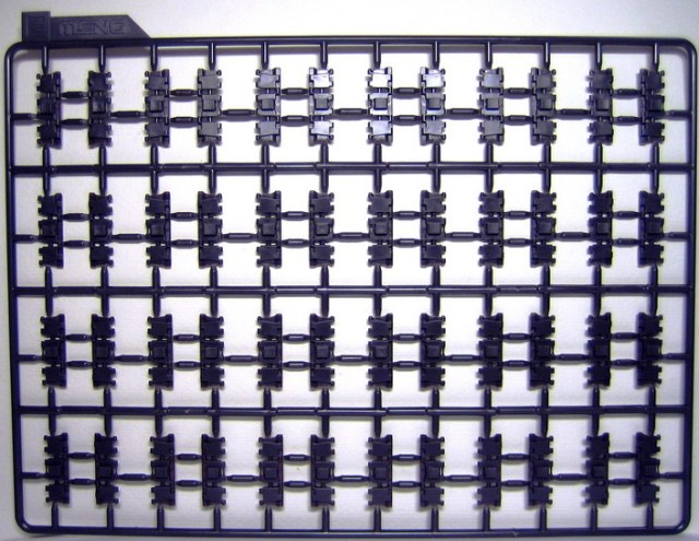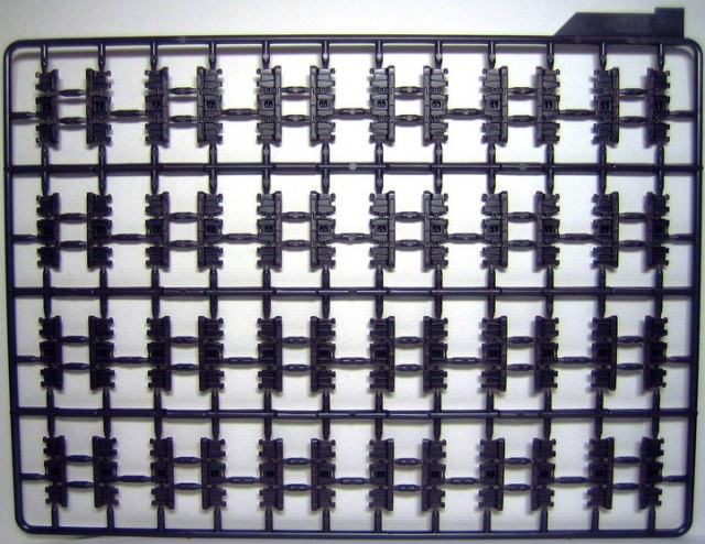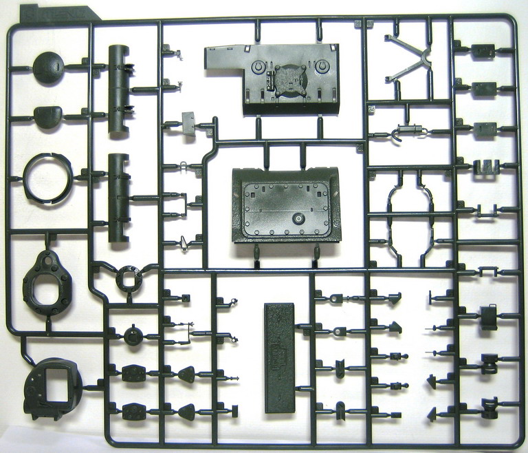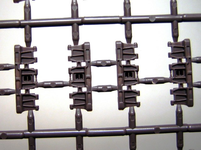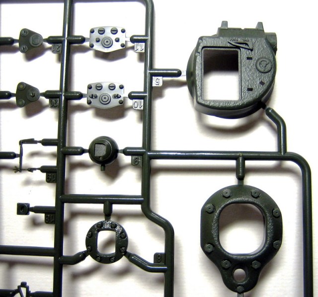 В коробке с вертикальной загрузкой находятся 6 литников с деталями из пластика темно-зеленого цвета, 3 литника с наборными траками светло-коричневого цвета. Ванна и верхняя часть корпуса представлены отдельными деталями. Все литники упакованы в полиэтиленовые пакеты. При беглом осмотре каких-либо критических замечаний по качеству отливок высказать не могу. На первый взгляд всё идеально, литьевые швы еле заметны; следов толкателей на видных местах, утяжин, недоливов, облоя не обнаружено. Проработка мелких деталей на высоте, довольно хорошо имитирована фактура брони. Части корпуса стыкуются идеально, всё остальное будет выявлено при сборке. Цилиндрические детали типа ствола и гранатометов даны цельными деталями, что исключает обработку швов после склейки, и это очень радует. Стволы пулеметов Besa, коих тут 3 штуки, я бы заменил на металлические, что и сделаю собственно, благо они есть в ассортименте RB-modelи других производителей.
