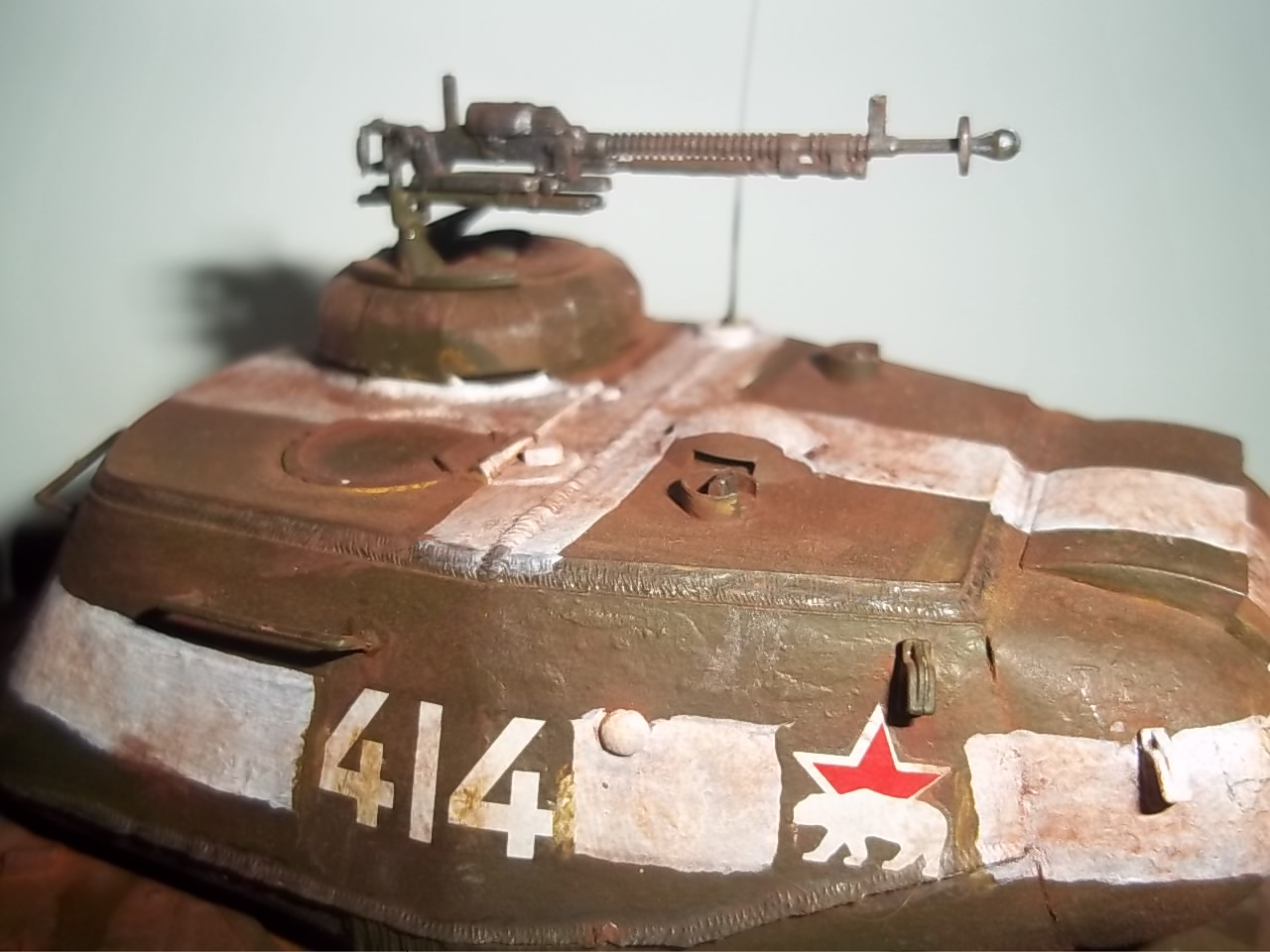 Теперь здравствуйте.Моя следующая работа, модель от отечественной марки, и качеством и ценой меня удовлетворила.Облоя и утяжин не обнаружено, в наборе были виниловые гуслянки.Собиралась не плохо из дороботок добавил фару,аннтену и всё,не понравилось что не было коробки от ДШК ( с патронами).Красил модель акрилом от того же производителя, что и сам кит, применил смывку,обгадинг пастель.Вот и всё.Приятного просмотра