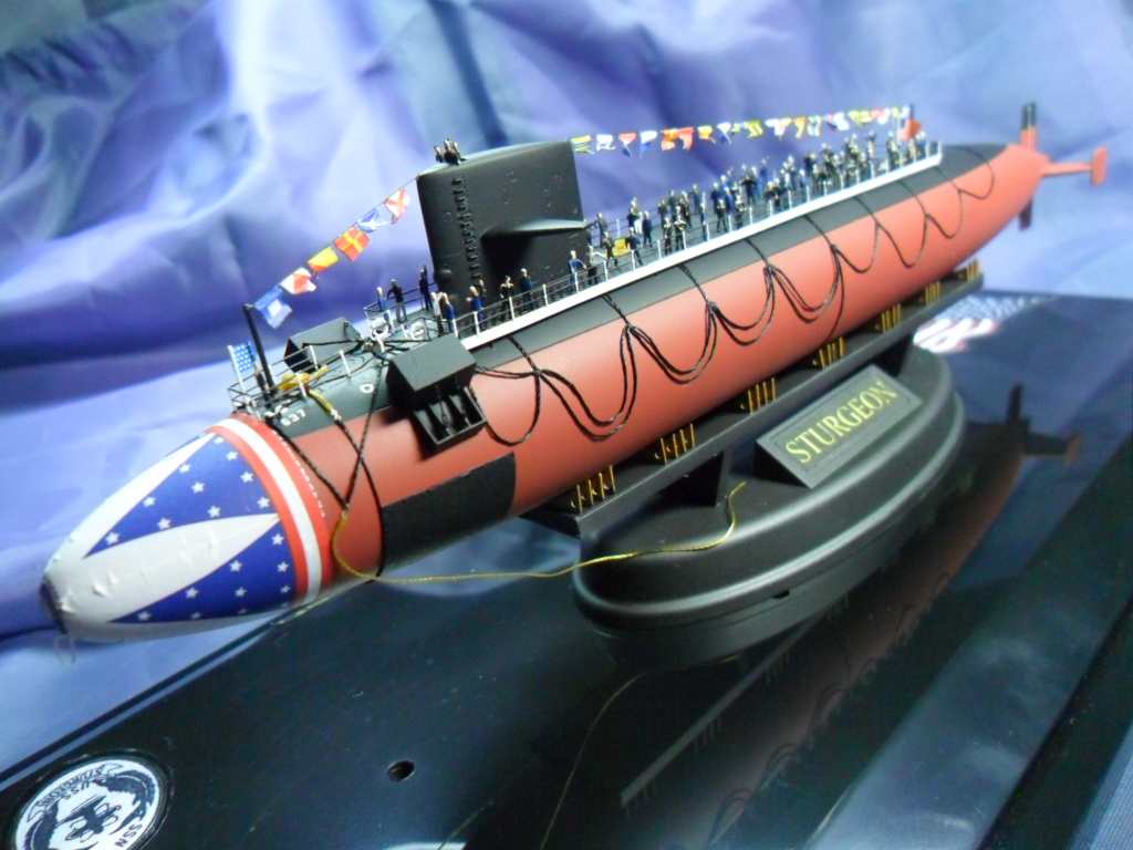 При спуске на воду, на всех субмаринах класса STURGEON не было гребного винта, его заменял конус-обтекатель, причем, если лодка спускалась носом вперед, этот конус держал разрисованный в амеровскую символику кружок (видимо из фанеры). Именно по этому, чтобы не вредить историчности, я винт устанавливать не стал.