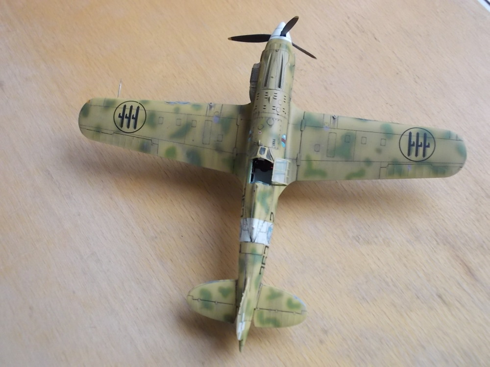 Набор Хасегавы относится к одним из лучших по данному самолёту,и это правда. Но не покидало желание немного улучшить модель.В ниши шасси добавил проводку и трубопроводы,в кабину - электропроводку и рукоятки закрытия фонаря,ремни на кресло пилота.Просверлил воздухозаборники,поставил механический прицел.К сожалению некоторые лючки по верху капота были затёрты при зашкуривании,недолго думая вырубил подходящие по размеру из плёнки-самоклейки с помошью обработанного обрезка радиоантены от приёмника.Красил нитрой,потом футура,после наклейки декалей расшивку выделял по стандартной схеме - разведённая эмаль Хамбролл на уайт-спирите с последующим вытиранием вдоль крыла и сверху-вниз по фюзеляжу,заодно и как-бы смывка получилась.Тросс антены - из проволоки авиационного самописца (теперь жалею,что решил его покрасить). Случайно подломал мачту антены,вот она и кривовата. Финишное покрытие - полуглянцевый лак Хамбролл на уайт-спирите.