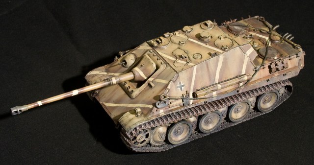 Еще одна немецкая Пт ВМВ. По легенде одна из Ягдпантер, сражавшихся в северной Италии, во всяком случае этот камуфляж заявлялся именно так. Модель была собрана и окрашена в базовые цвета еще летом, а потонирована в течении этой недели. Техника везеринга использовалась традиционная (для меня, во всяком случае). Имхо, получилась весьма неплохая Яга.