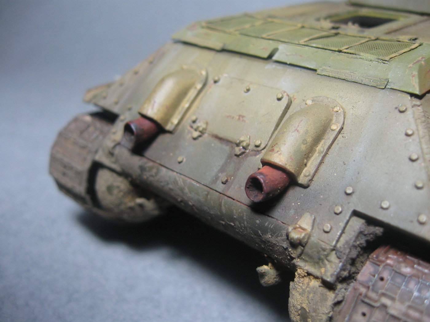 Если уж так нравится красить, то вышеуказанное замечание абсолютно правильное. При приближении фото прекрасно видно как окрашены катки и траки. Катки в грязи с торца, следов на траках от них нет. Потёртостей и сколов в местах посадки экипажа невидно.