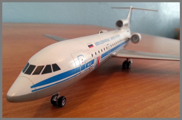 Здравствуйте, друзья! Хочу поделится с Вами последней своей моделью - Як-42 от фирмы RusAir. Это моя первая смоляная модель, и ощущение от сборки осталось двоякое. Вообще, сам набор мне понравился, литьё хорошее. Из косяков был только скол на стабилизаторе (устранён шпаклёвкой) и незначительное количество воздушных пузырьков, при чём они начинают появляться когда начинается обработка модели. Ни какой задачи по деталировке я перед собой не ставил, просто собрал из коробки. Из доработок лишь заменил створки шасси, так как родные были очень толстыми, просверлил фары. Красил тамией и аканом. Декали легли хорошо, правда иллюминаторы чуть не совпадают друг с другом, и декаль немного толстовата. Получил только приятные ощущение от сборки, на постройку ушло чуть больше месяца, на покраску неделя.