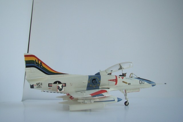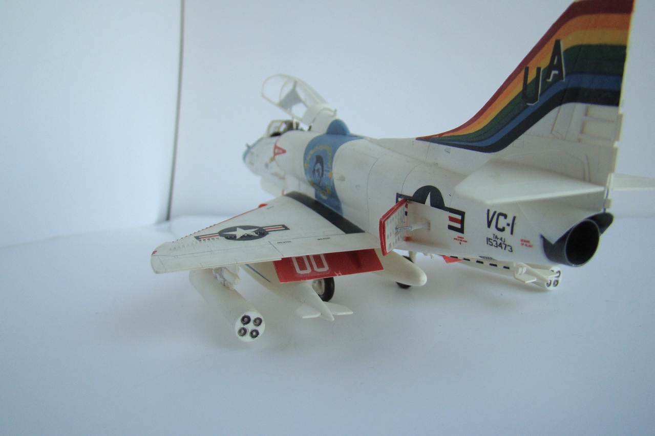 Здравствуйте. Немного из истории создания прототипа. Первый Skyhawk установил мировой рекорд скорости, показав в полете на 500 км по замкнутому маршруту среднюю скорость более 695 миль/час (1118 км/ч). Эгот самолет выпускался во многих модификациях на протяжении более 20 лет. Учебно-тренировочная модель TA-4J Skyhawk была разработана по заказу ВМФ США. Ее особенности - удлиненный фюзеляж, двухместная кабина, меньший запас топлива, базовая авионика, одна пушка.