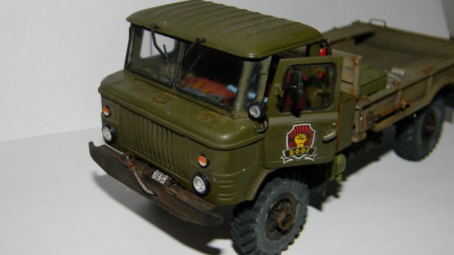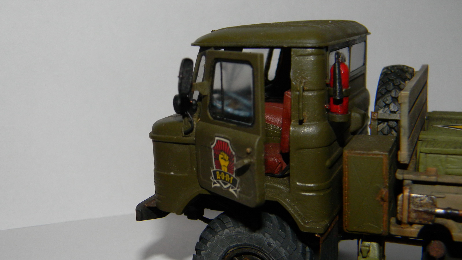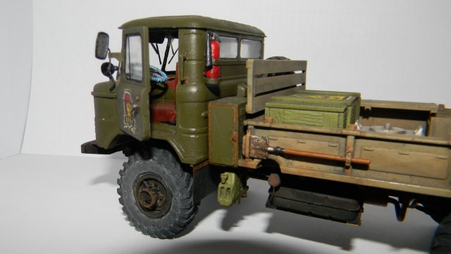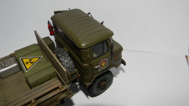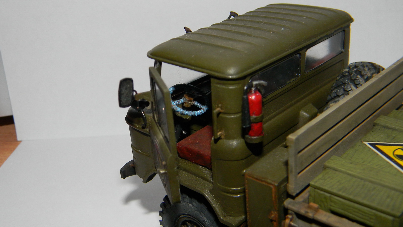 Добавил лебедку с коушем (мне так понравилось); в салоне рюкзак, аптечка, автомат; огнетушитель; крепление канистры и канистра; колеса от оружейника; декали от мира магии; в кузове ящик с каким то опасным грузом, бак для воды.