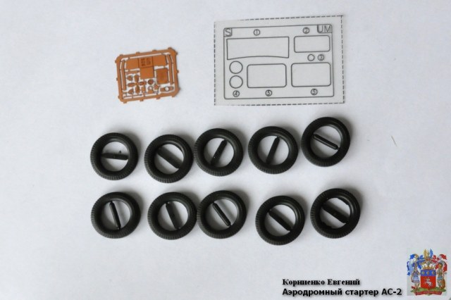 В набор входят литники в количестве 4 штук, фототравление (скромненькое), колеса (резина) – 10 штук, деколь и пленка вместо стекол. Литье хорошего качества. Про стыкуемость ничего сказать не могу.
