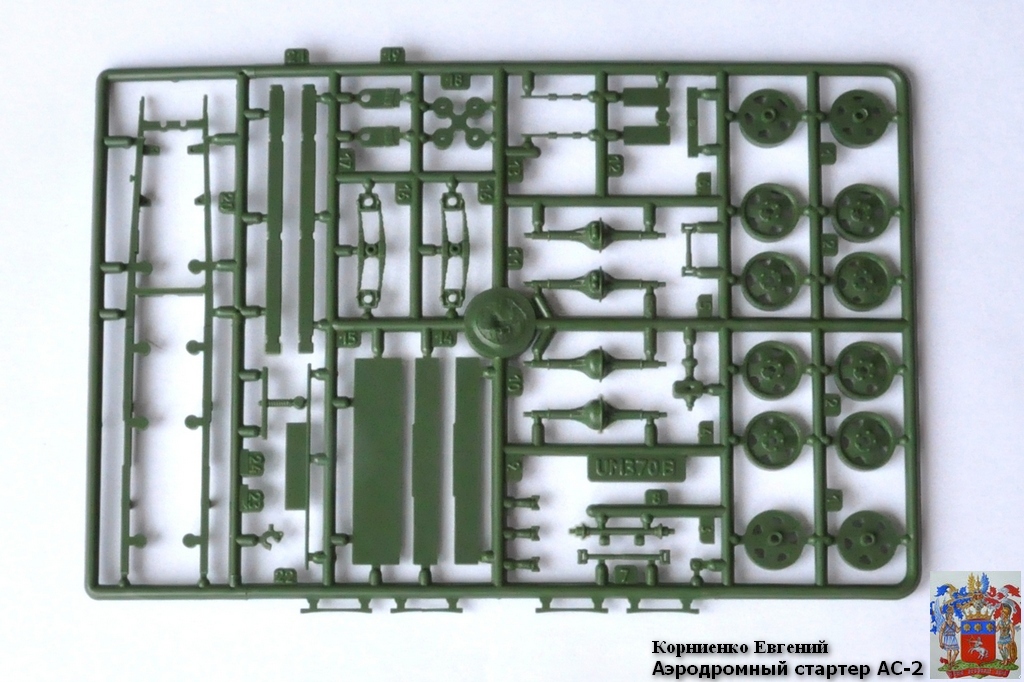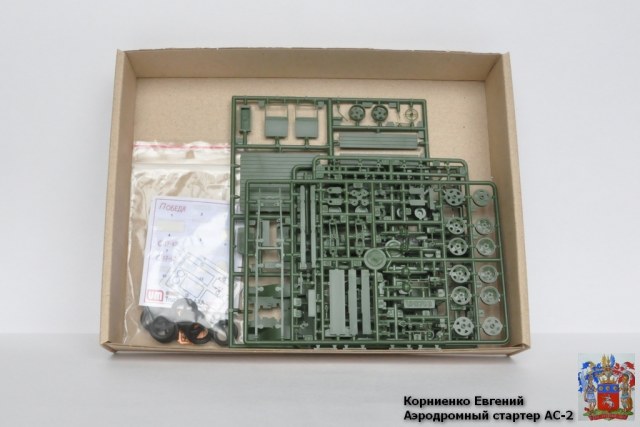 И так набор. Модель упакована в плотную картонную коробку. На лицевой стороне изображен непосредственно Аэродромный стартер АС – 2.