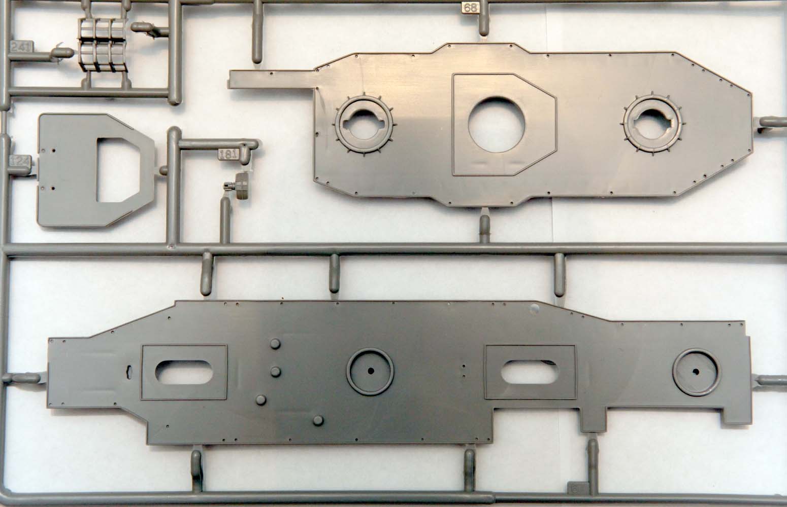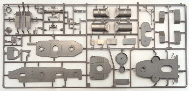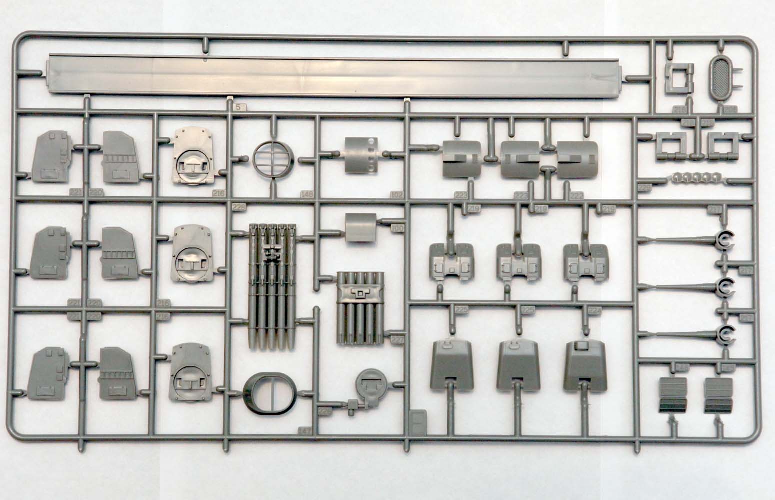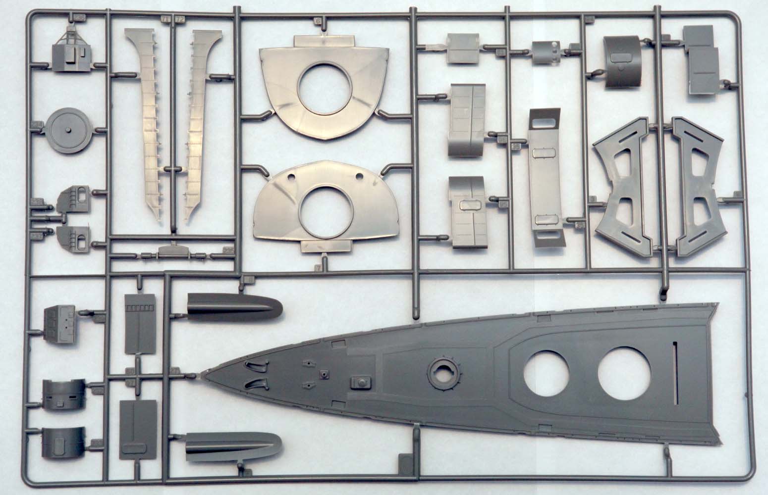 В огромной коробке находятся половинки корпуса, 11 литников светло-серого пластика, 1 литник с прозрачными деталями, нить для лееров, инструкция и декали... клей и краски в набор не входят.