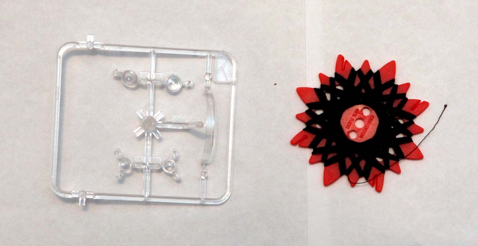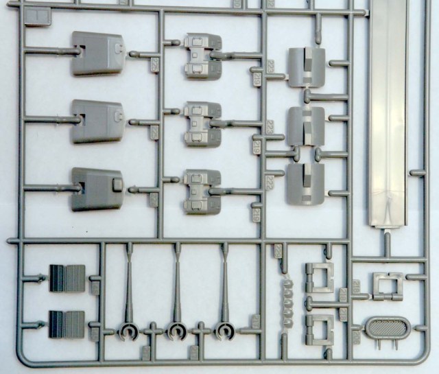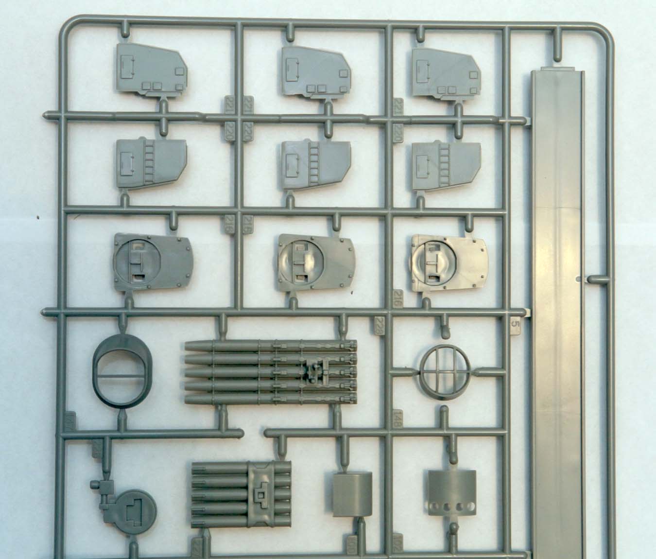 В огромной коробке находятся половинки корпуса, 11 литников светло-серого пластика, 1 литник с прозрачными деталями, нить для лееров, инструкция и декали... клей и краски в набор не входят.
