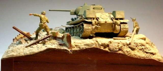 ...Ваша диорама понравилась больше,ощущается динамика.Можно было "для полноты картины" сделать рабочую ходовую,ведь на поле боя найти абсолютно ровную площадку весьма трудно,чтобы поставить на неё танк или в данном случае,поймать такой момент.