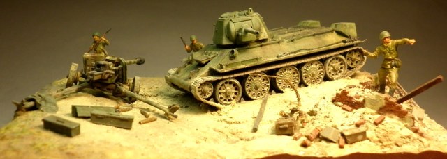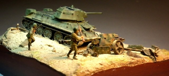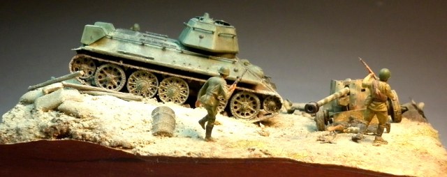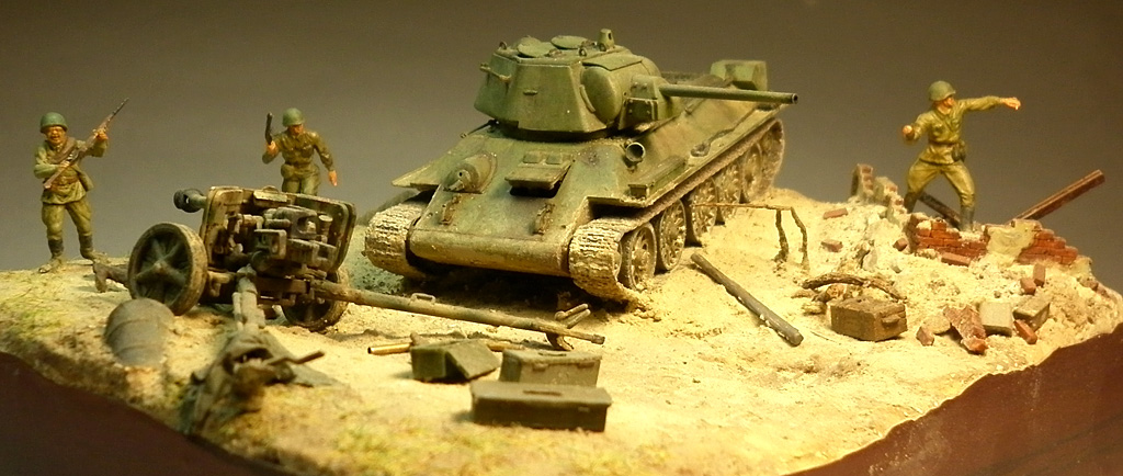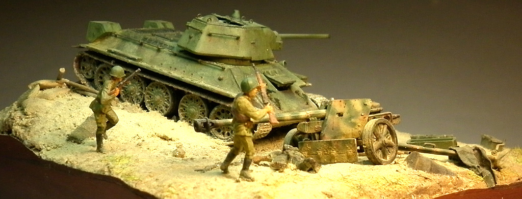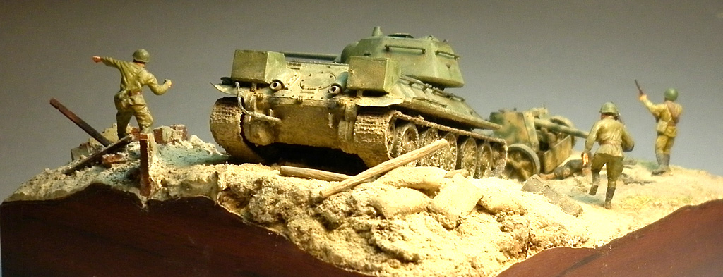 Попытался изобразить момент второй половины июля 1943 года, переход советских войск в контрнаступление на южном фасе Курского выступа. Тридцатьчетверка преодолела окоп и мчится на пушку. Расчет оставил ее в бегстве. За рычагами танка сидит механик-водитель, в башне - заряжающий и командир танка на фото не видно так как люки приоткрыты по-боевому. Перед щитом орудия лежит уитый немецкий солдат. Пехота добивает отступающих немцев.