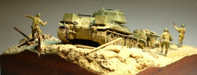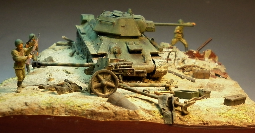 В композиции были использованы следующие модели: Т-34 обр. 42 (Dragon №7266), пушка Pak-40 (Roden), набор аксессуаров (Italeri), стены и руины II этой же фирмы, фигура из набора немецкая пехота (Revell), экипаж тридцатьчетверки – Preiser, ящики из наборов Моделиста и Waterloo, никелевые трубочки Modelpoint. Также были использованы природные материалы, искусственное травяное покрытие Звезда, гипс, сода. Окраска производилась различными красками: эмаль Tamiya, акрил и "Супер" Звезды, металлики Revell, смывки - масло Невская Палитра. Для тонирования были использованы пигменты MIG и Tamiya.