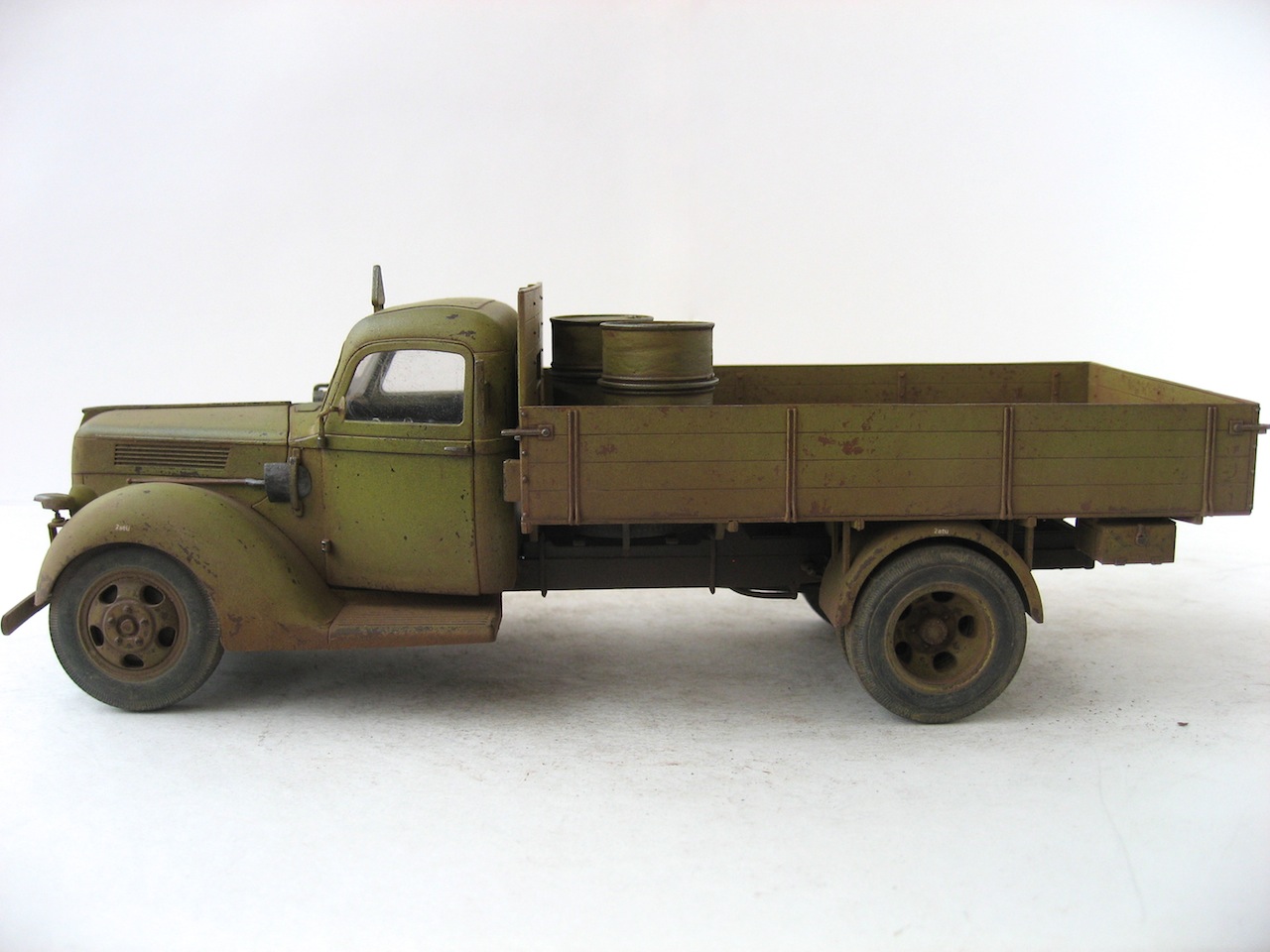 Представляю свой первый опыт в постройке грузовиков. По-этому, сделал из коробки без особых излишеств. Добавил только АКашные фары и Тамиевские бочки. Собиралась модель, на удивление, легко. Только в конце, были некоторые проблемы. Новый ICM собирал впервые. Так что для первого раза, все отлично. Красил акрилом Tamiya. Масло, пигменты MIG.