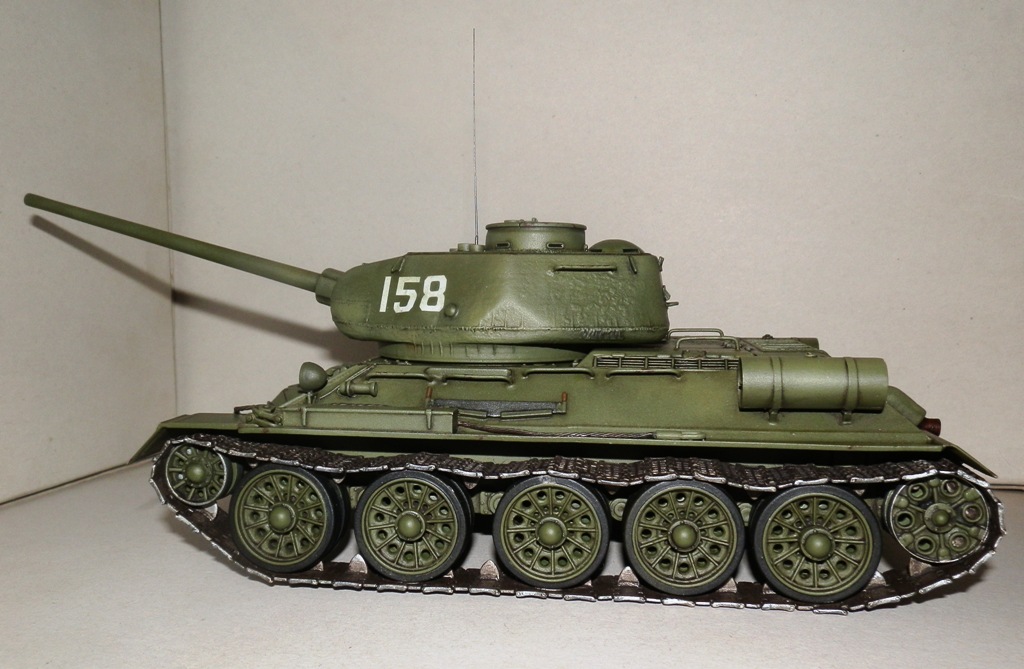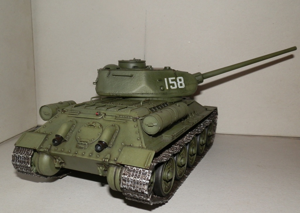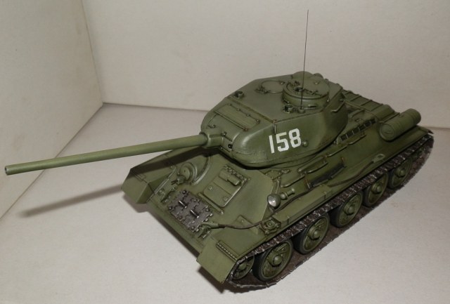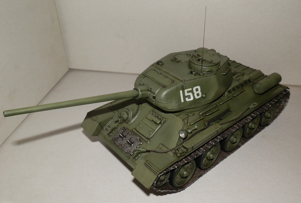 Уважаемые Коллеги, рискну представить на Ваш суд, недавно завершенную модель танка Т-34/85, в моем исполнении. Танк собирал из двух наборов- верх корпуса и башня от Звезды, низ и ходовая от Макета. Пытался воспроизвести позднюю машину УВЗ. За прототип взял фото танка 6-й гвардейской танковой армии на побережье Ляодунского залива 22 августа 1945. Из доработок- сварные швы на башне и корпусе, проволочные скобы, самодельные жестяные топливные баки, проводка. Также заменил всю мелочевку на корпусе на макетовскую, слегка доработал грязевые щитки, петли, болты, приборы наблюдения, ящики зип, пулеметы. Трос металлический(второй вешать не стал), фара Эльф, траки и катки Макет. С траками немного промахнулся, провис вышел великоват. При покраске тренировался в технике высветлений/затемнений различными оттенками, не знаю, на сколько это "модуляция", но как уж вышло. Декали из запасов, к сожалению цифр меньшего размера не нашел((. Краски акрил Валехо, мешал сам. Тонирование смывками Миг и Тамия, масляная краска Сонет. Пачкать и пылить не стал, достойно пока не выходит. Финишное покрытие матовый лак из баллона. Модель делал с претензией на мат часть, поэтому буду рад выслушать Вашу справедливую критику.