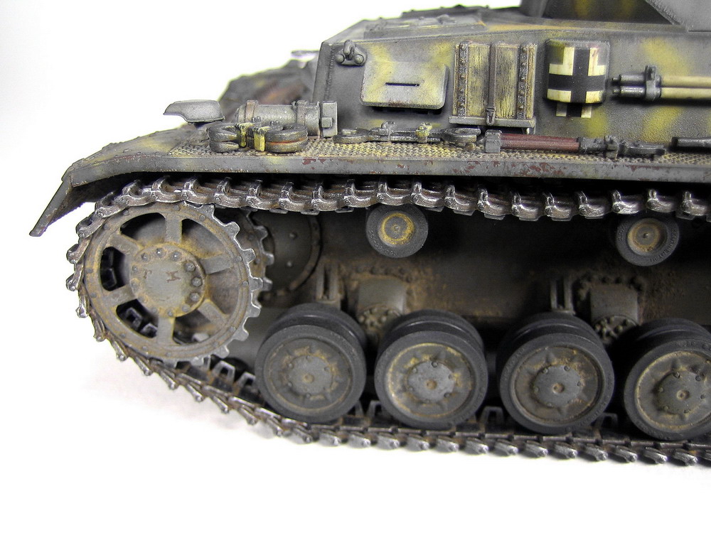 Сборка никаких хлопот не доставила. Шпаклевка не использовалась вообще. Единственно, в местах стыков деталей ванны пришлось сымитировать литником два сварных шва. Немного пришлось повозиться с удалением следов толкателей на траках и швов на катках, но это всё мелочи. В матчасти каких-либо критичных косяков не нашел. Изначально модель планировалась как искоробка, но кое-что все-таки слегка доработал и дополнил: