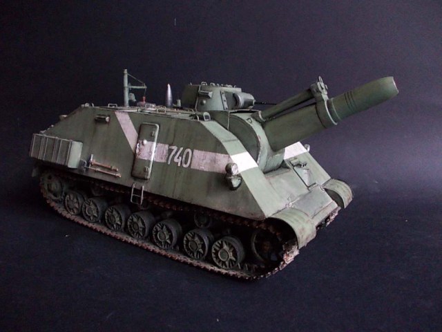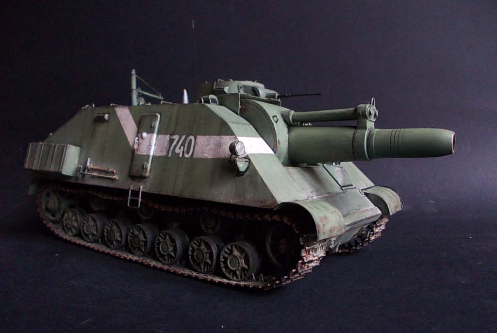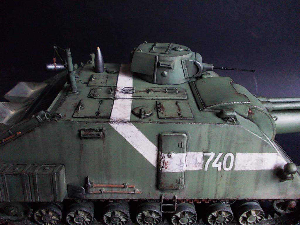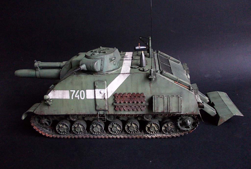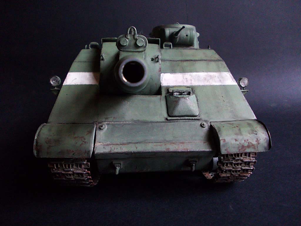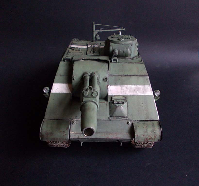 Черт возьми вот это ЗВЕРЬ! Вот такую штучку на фашистский полк пустить - и кирпичи в штанах гарантированы)))) Очень впечатлил ствол. Наверно под рукой где-то нашли?) Да, и передние опорн. катки наверно тонковаты для этой махины, я бы от КВ поставил. Удачи вам в создании следующего нереального прототипа и огромный респект.