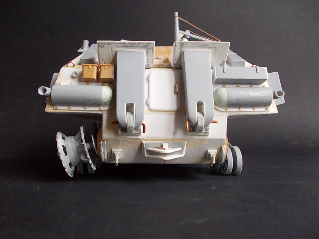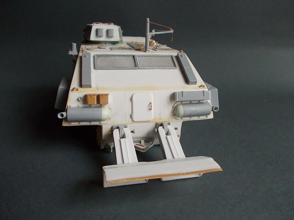 Может быть, надо было более тщательно продумать размещение отделений в корпусе - воздуховоды располагаются над входом в машину. Надо бы разделить боевое и машинное отделение, а оттуда плясать с воздуховодами, люками и прочим. Соглашусь - надо бы гидравлику на опорную лапу.