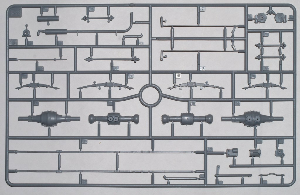 На коробке довольно лаконичный рисунок в стиле «Alanger” или « AFV Club”. Сама коробка не слишком большая, детали в ней уложены достаточно плотно. Детали «кабина» и «тент» отделены от прочих картонной вставкой. Литники чистые, без намёка на какой-нибудь облой и следы толкателей. Утяжины микроскопические, но кое-где присутствуют. Решётки радиатора и боковин двигателя отлиты ажурно, с отверстиями. Впрочем, подобное я уже видел у «Dragon”. Остекление кабины чистое, прозрачное, но хуже, чем у «Tamya”. В комплекте присутствуют нить для имитации буксирного троса (всё равно лучше заменить), и цепочка. Декали с номерами (опять же, по аналогии с «Dragon”), дают возможность собрать любую комбинацию. Но только вот подложка показалась толстой. Как и положено уважающим себя производителям, в коробке нашлась небольшая плата фототравления. Жаль только, «дворники» оставили пластиковые.